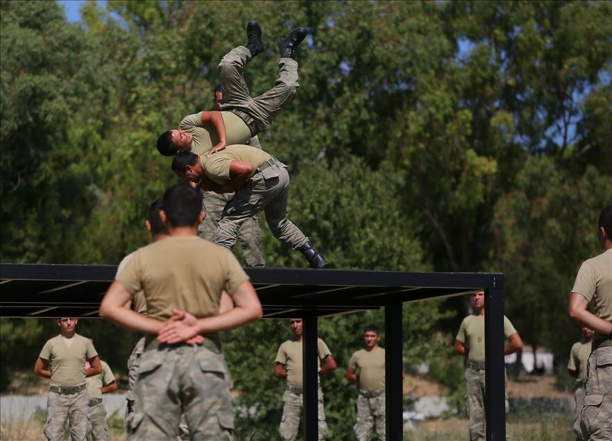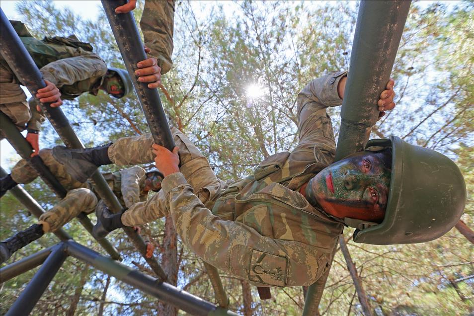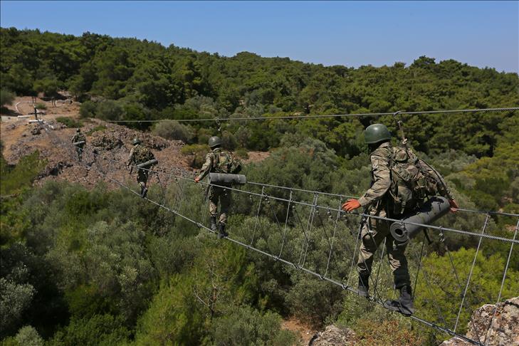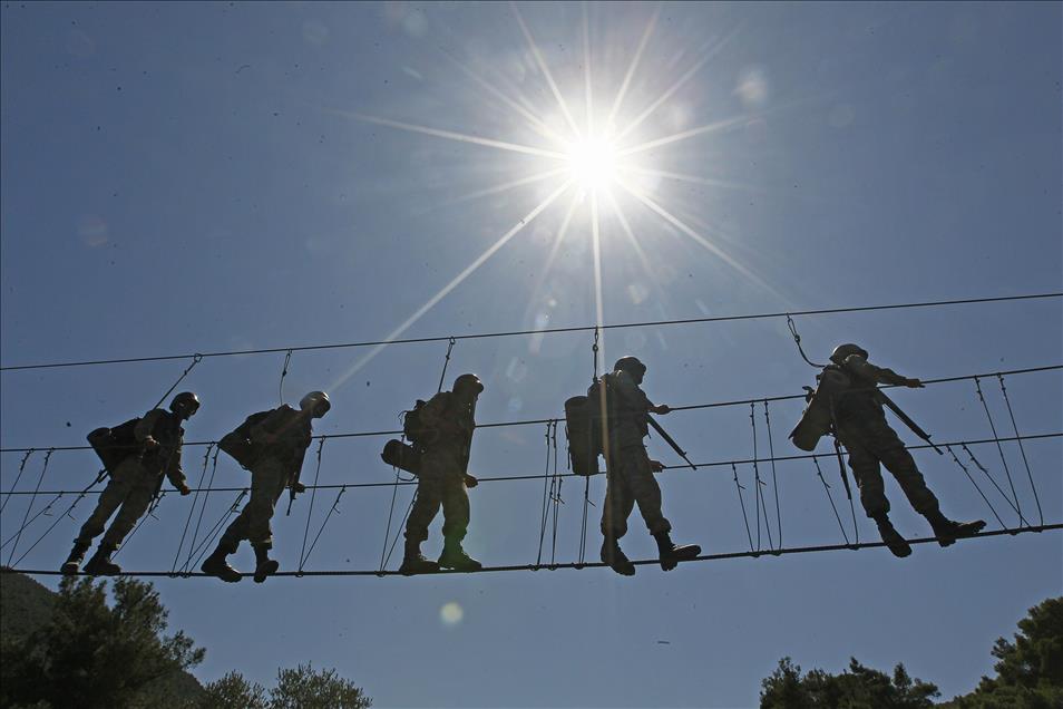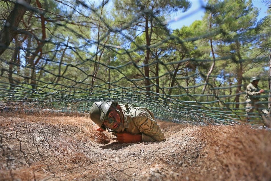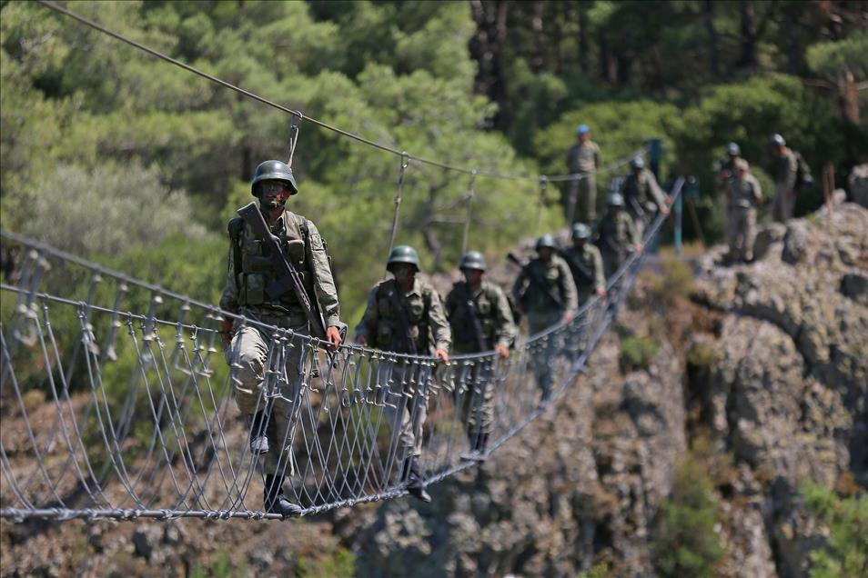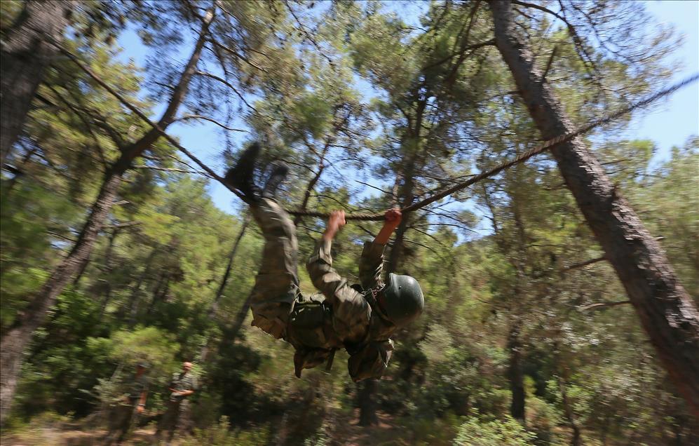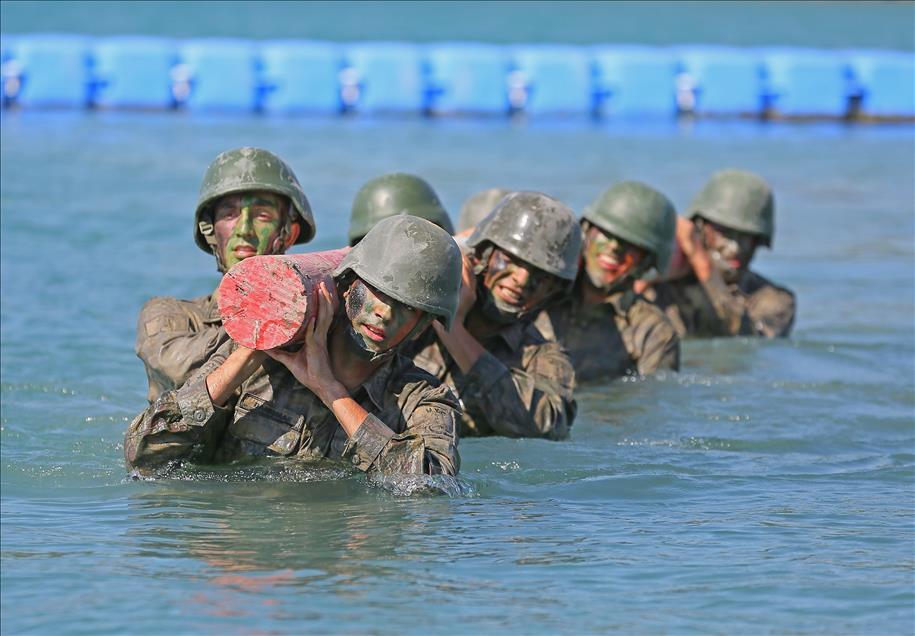 Kara Kuvvetleri Astsubay Meslek Yüksekokulu öğrencileri, Menteş Atışlı Tatbikat Bölgesi'nde düzenlenen kampa katılarak, 40 dereceye varan sıcaklıkta güç, irade ve sabır sınırlarının zorlandığı etaplarda teorik bilgilerini sahada uygulama fırsatı yakalıyor. Denizde kütük taşıyan tim üyeleri, kuleden eğitim elbiseleriyle denize atladıktan sonra, güç kazanmak ve bitirme sevincini zirveye ulaştırmak için deniz için eğitim elbiseleriyle parkur andı içiyorlar. (Emin Mengüarslan - Anadolu Ajansı)Emin Mengüarslan