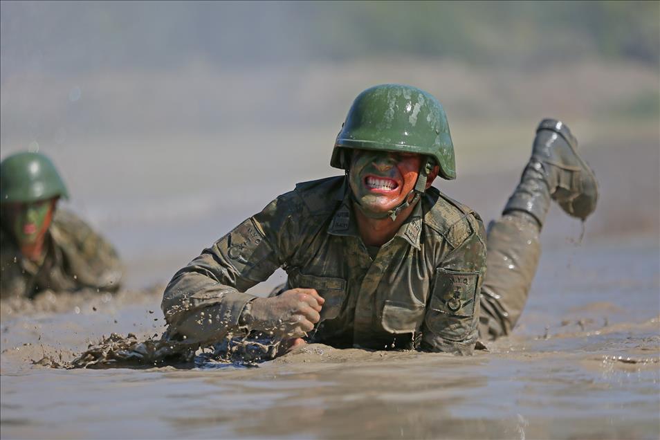 Kara Kuvvetleri Astsubay Meslek Yüksekokulu öğrencileri, Menteş Atışlı Tatbikat Bölgesi'nde düzenlenen kampa katılarak, 40 dereceye varan sıcaklıkta güç, irade ve sabır sınırlarının zorlandığı etaplarda teorik bilgilerini sahada uygulama fırsatı yakalıyor. İkinci aşama olan engelli koşu parkurunu teçhizatlı olarak giren öğrenciler, bomba isabet parkurunun ardından, çamur engel havuzuna giriyor. (Emin Mengüarslan - Anadolu Ajansı)Emin Mengüarslan