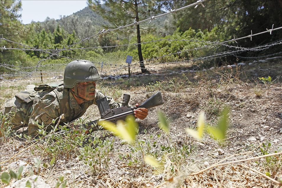 Kara Kuvvetleri Astsubay Meslek Yüksekokulu öğrencileri, Menteş Atışlı Tatbikat Bölgesi'nde düzenlenen kampa katılarak, 40 dereceye varan sıcaklıkta güç, irade ve sabır sınırlarının zorlandığı etaplarda teorik bilgilerini sahada uygulama fırsatı yakalıyor. (Emin Mengüarslan - Anadolu Ajansı)Emin Mengüarslan