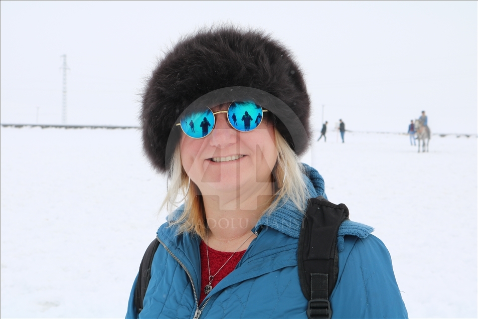 Orta Asya'dan Anadolu'ya uzanan ve Kars'ın Selim ilçesinde kar üzerinde oynanarak yaşatılmaya çalışılan ata sporu cirit, yerli ve yabancı turistleri bölgeye getiren Doğu Ekspresi sayesinde yoğun ilgi görüyor. İstanbul'dan gelen turistlerden Reyhan Bostancı, açıklamalarda bulundu. ( İsmail Kaplan - Anadolu Ajansı )İsmail Kaplan