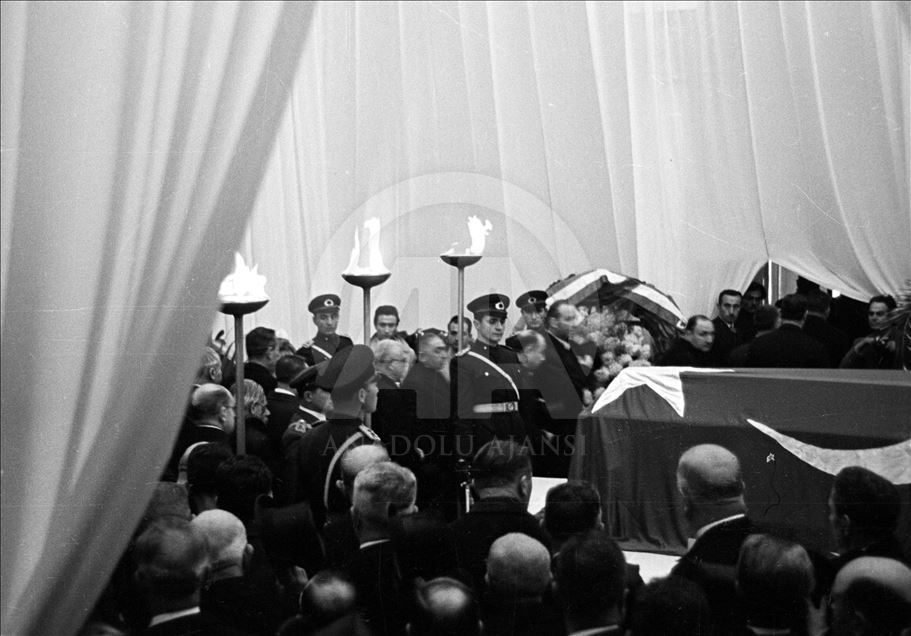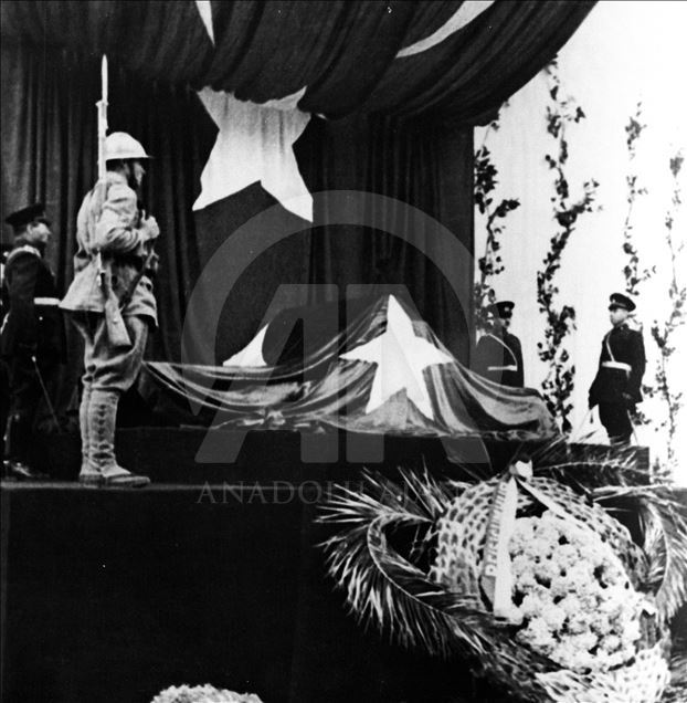 20 Kasım 1938'de Mustafa Kemal Atatürk'ün İstanbul'dan getirilen cenazesi meclis önündeki katafalka yerleştirildi. (Arşiv)