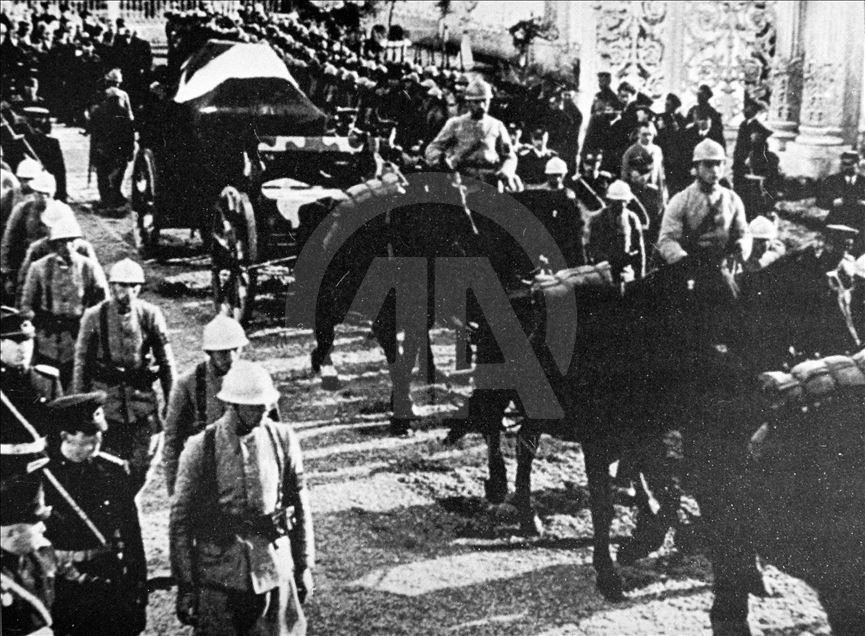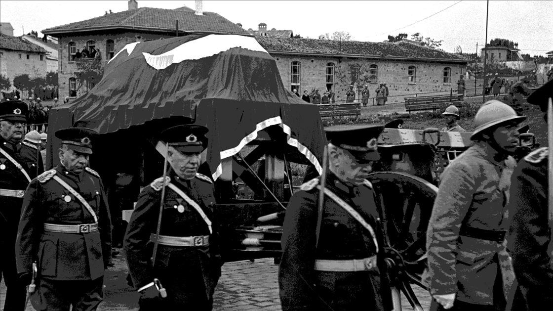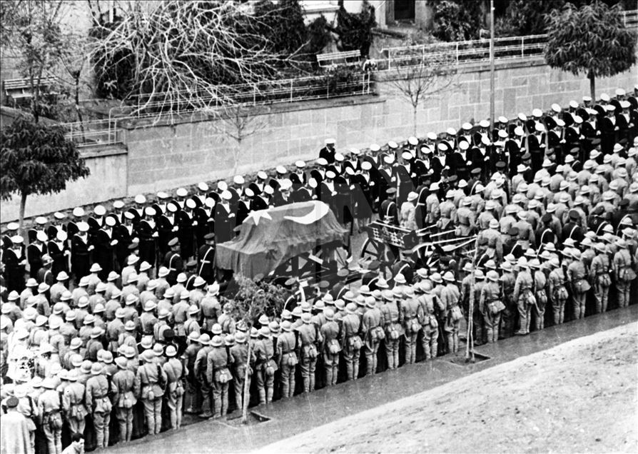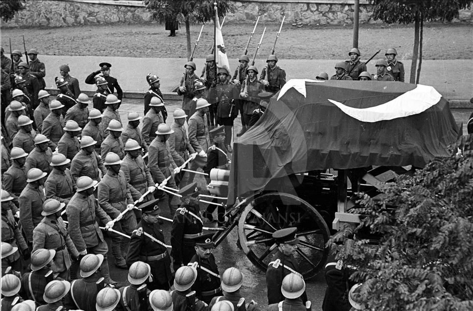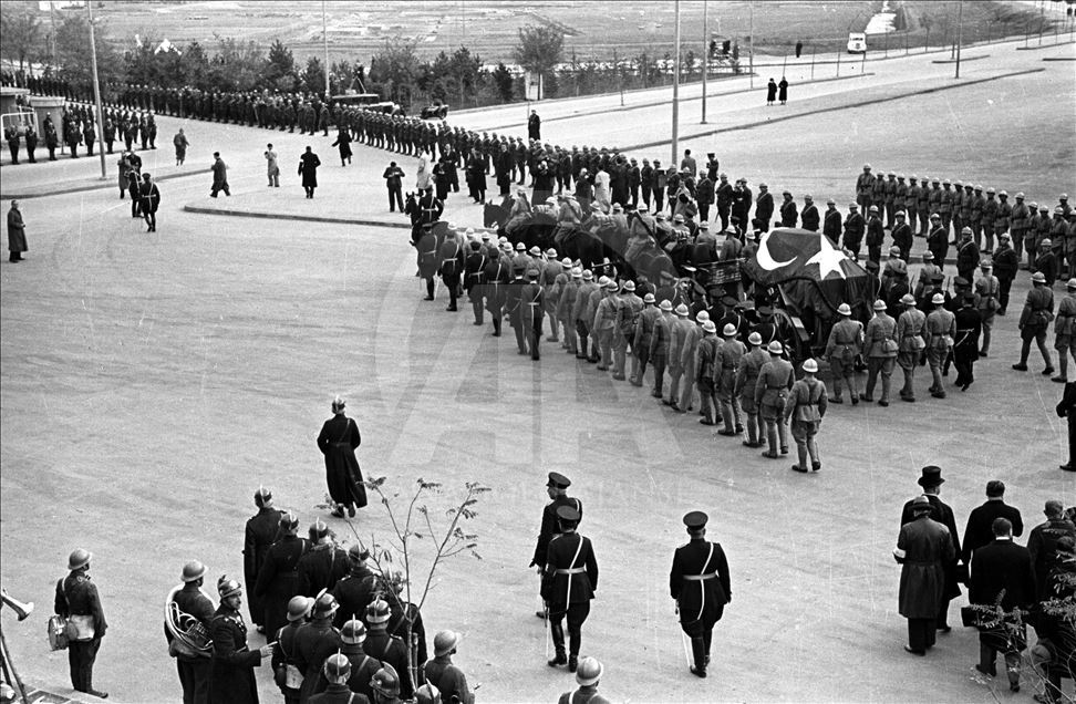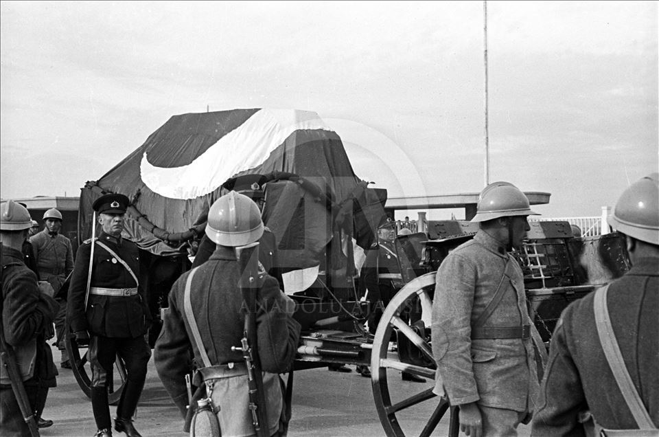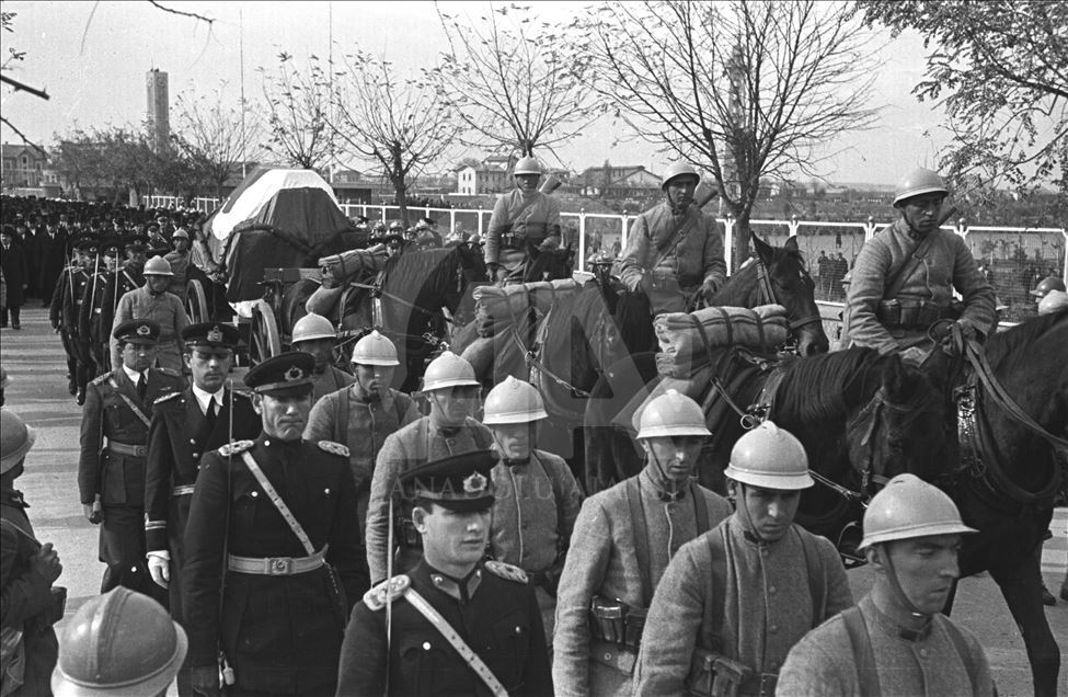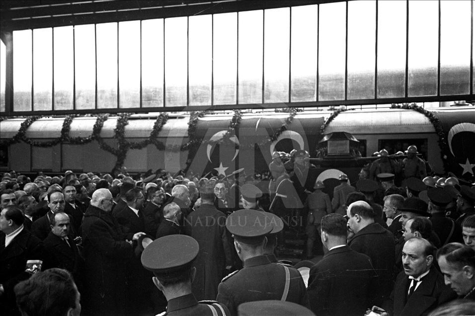 20 Kasım 1938'de Mustafa Kemal Atatürk'ün trenle Ankara'ya getirilen cenazesi garda top arabasına konularak, oluşturulan kortej eşliğinde TBMM'ye götürüldü. (Arşiv)