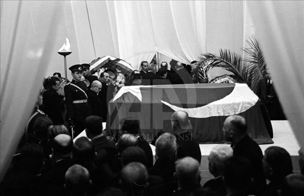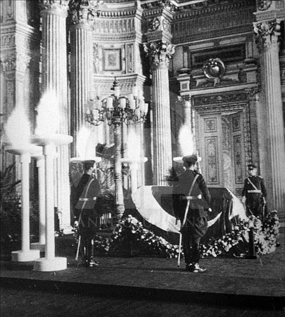 21 Kasım 1938'de Mustafa Kemal Atatürk'ün cenazesi Etnoğrafya Müzesi'nde Katafalkta. (Arşiv)