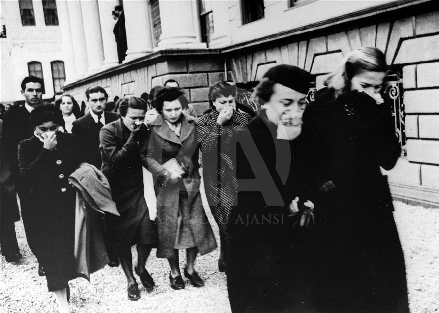 17 Kasım 1938'de Atatürk'ün Dolmabahçe Sarayı'daki naaşı önünden saygı geçişi yapan yurttaşlar gözyaşları içinde son görevlerini yerine getirdi. (Arşiv)