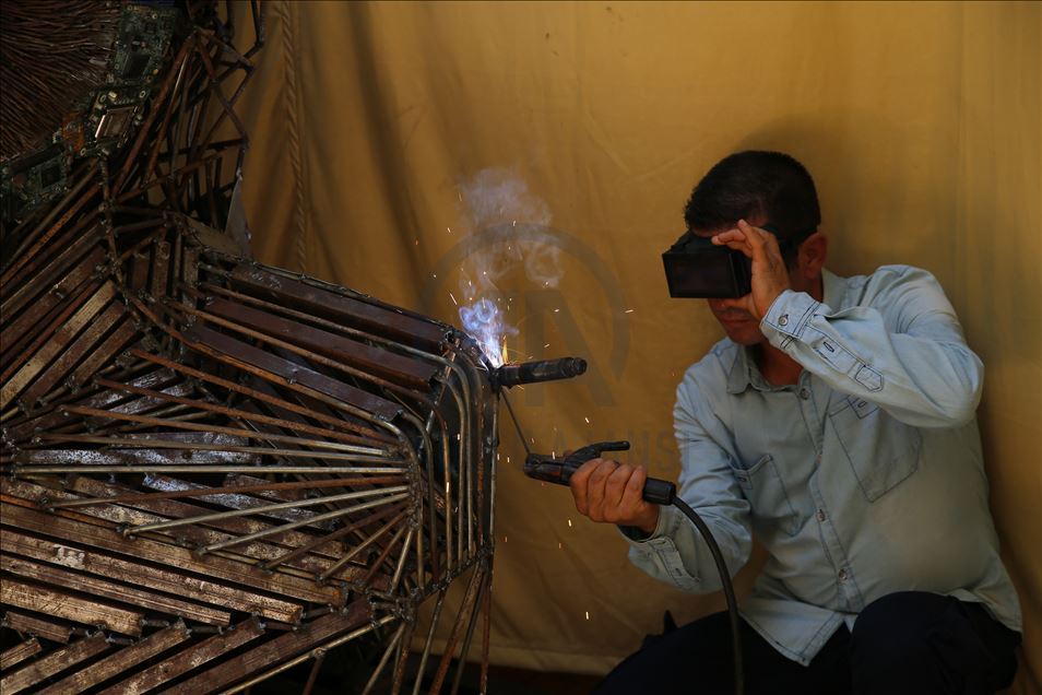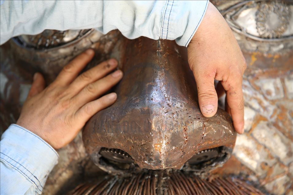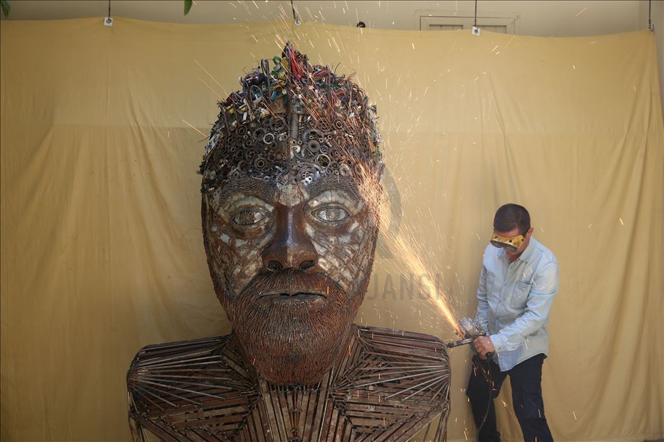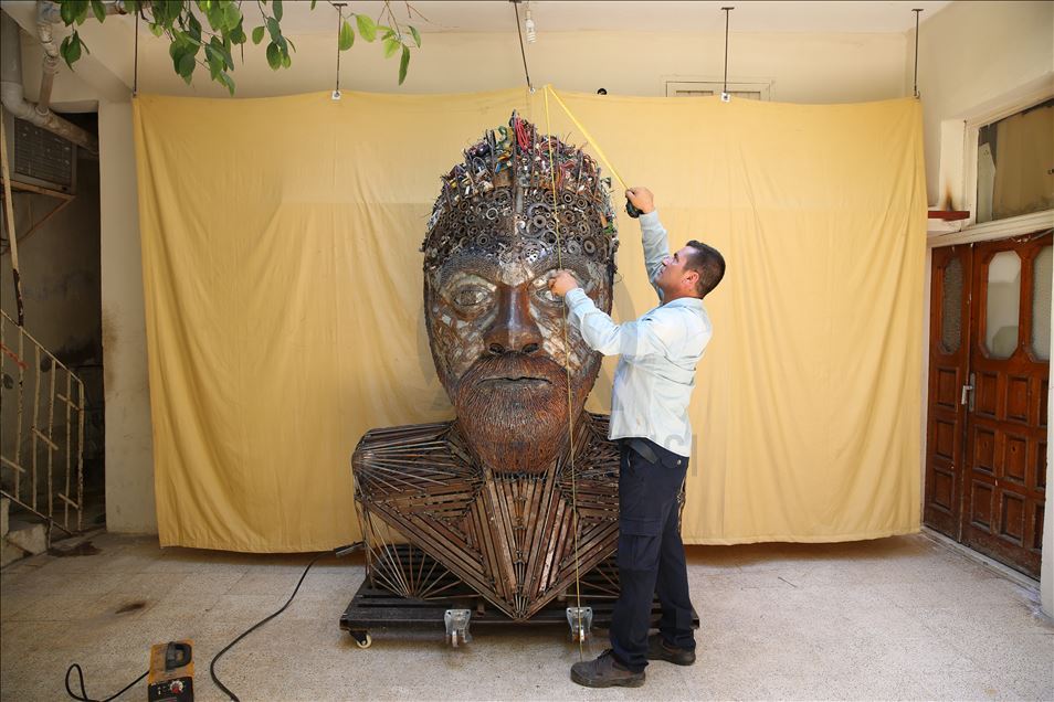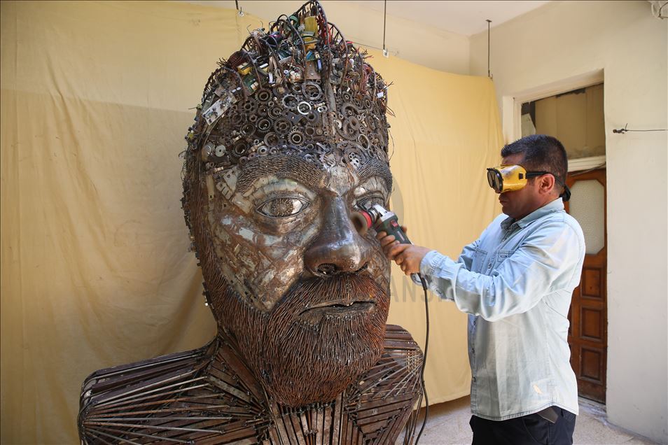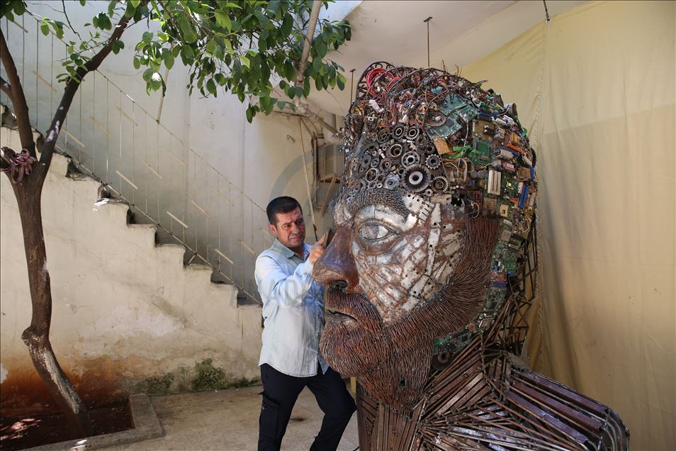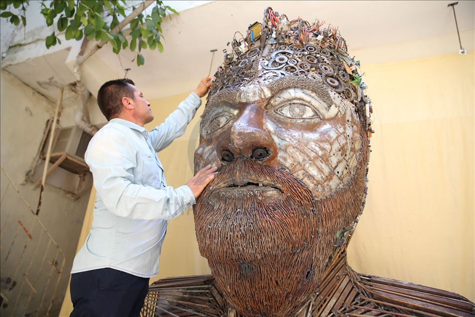 Hatay'ın Reyhanlı ilçesinde yaşayan mozaik ustası Mervan Altınorak, çevre kirliliği konusuna dikkat çekmek için hurda otomobil, tır, kamyonet, traktör ve motosikletlerden topladığı 50 bin parçadan 500 kilogramlık 2,5 metre boyunda insan portresi yaptı.