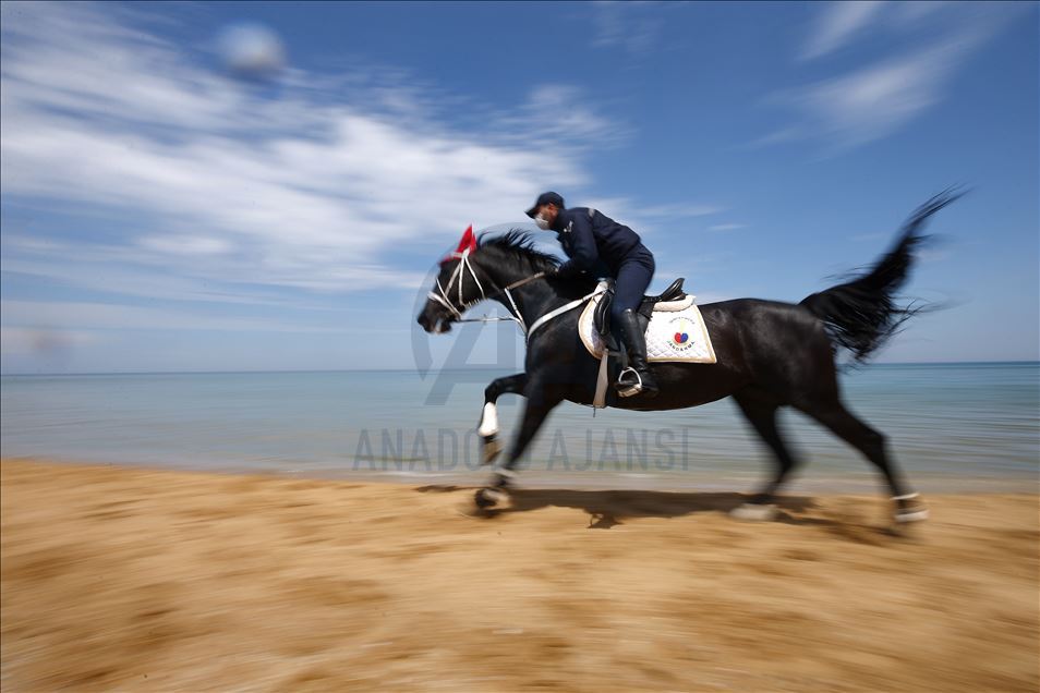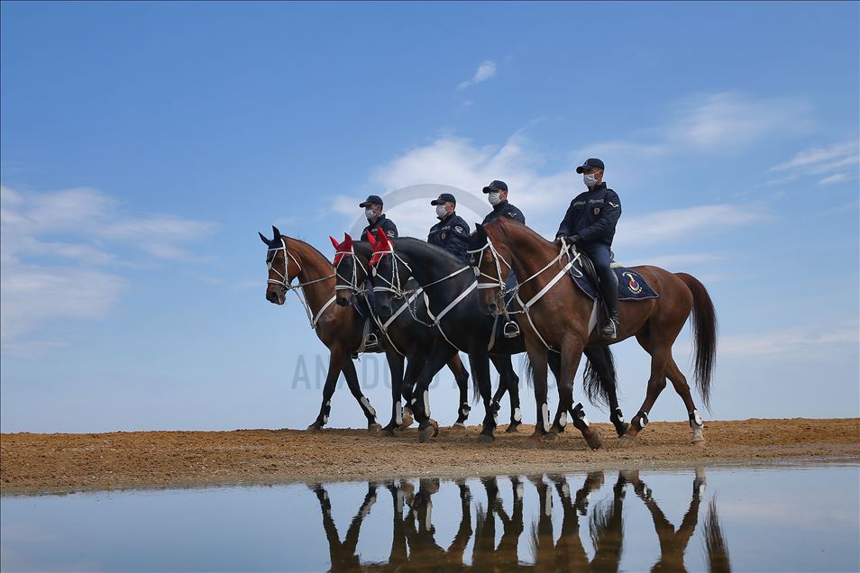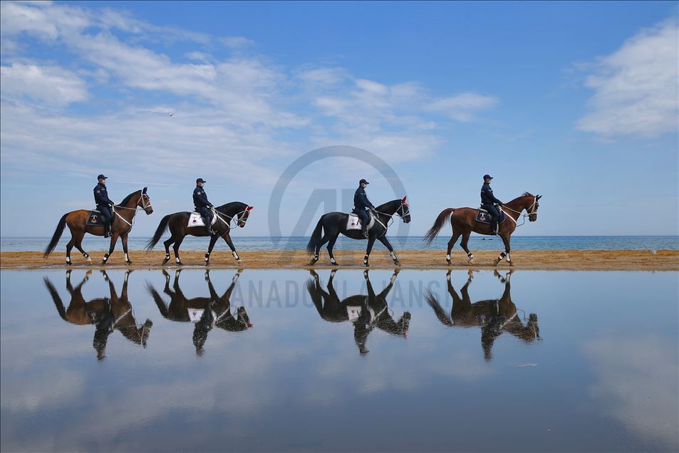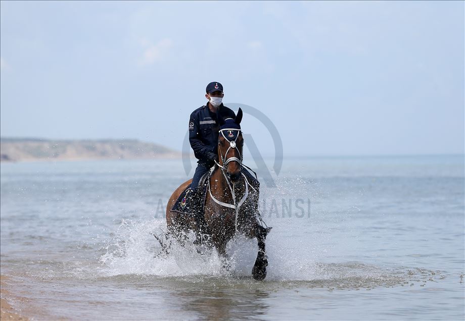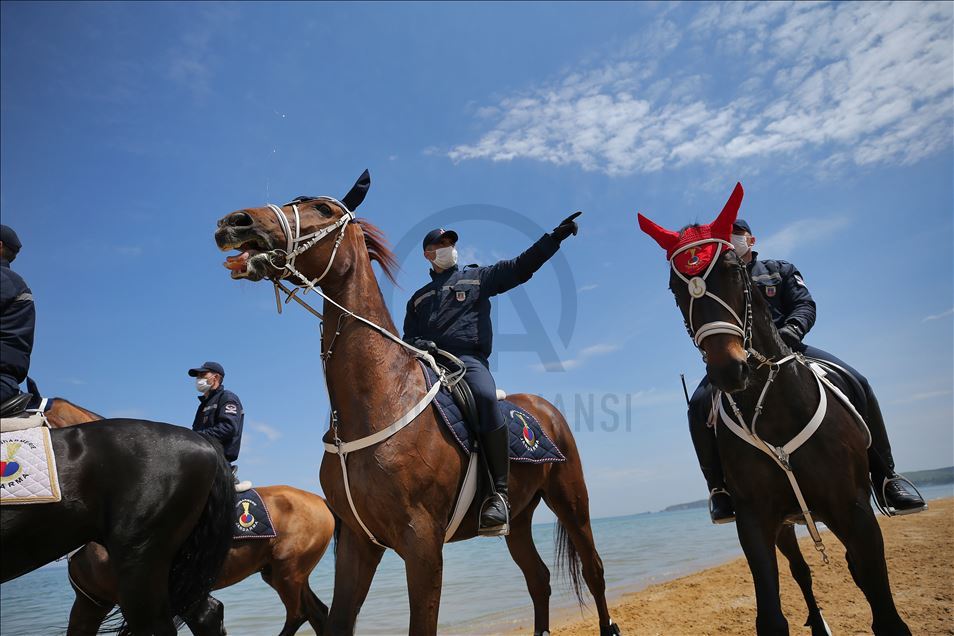 Yeni tip koronavirüsle (Kovid-19) mücadele kapsamında alınan sokağa çıkma kısıtlamasının ikinci gününde İstanbul sahillerindeki denetim görevini, atlı jandarma timleri üstlendi. Ekipler, Sarıyer ve Şile sahillerinde görev yaptı. Sarıyer'e bağlı Gümüşdere Mahallesi'ndeki plaja gelen atlı timler, sahil boyunca denetim gerçekleştirdi. ( İsa Terli - Anadolu Ajansı )İsa Terli