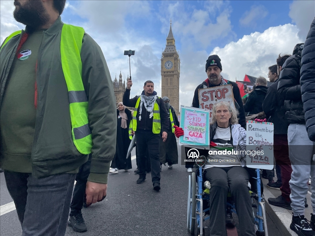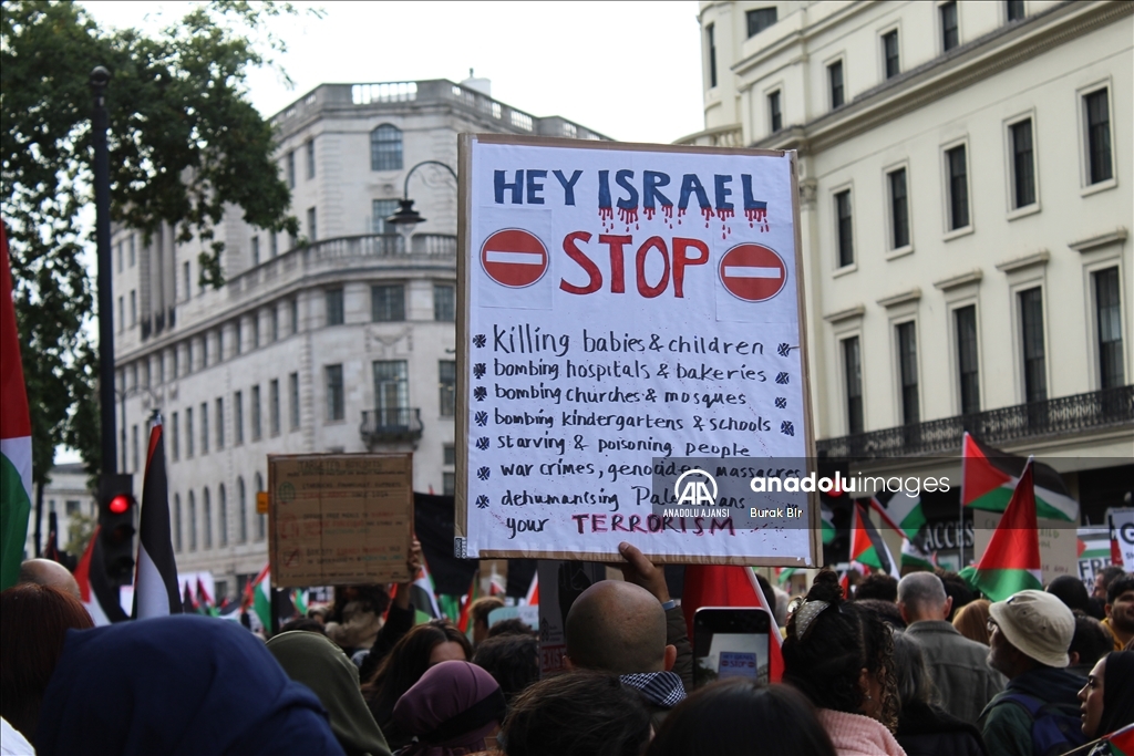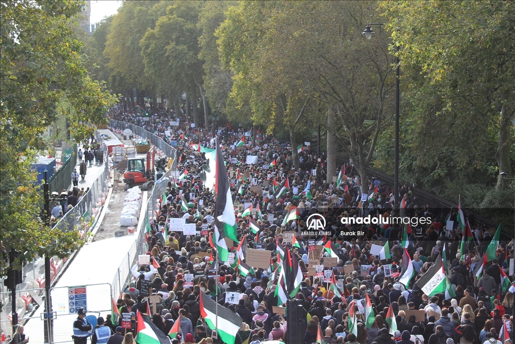 İngiltere'nin başkenti Londra'da Filistin'le dayanışma gösterisi için toplanan on binlerce kişi, polisin yoğun güvenlik önlemleri altında üçüncü kez yürüdü. İsrail'in Gazze'ye yönelik saldırılarını yoğunlaştırmasını protesto etmek isteyen on binlerce Filistin yanlısı gösterici, öğle saatlerinde Thames Nehri kıyısındaki Victoria Enbankment'ta toplandı. ( Burak Bir - Anadolu Ajansı )Burak Bir