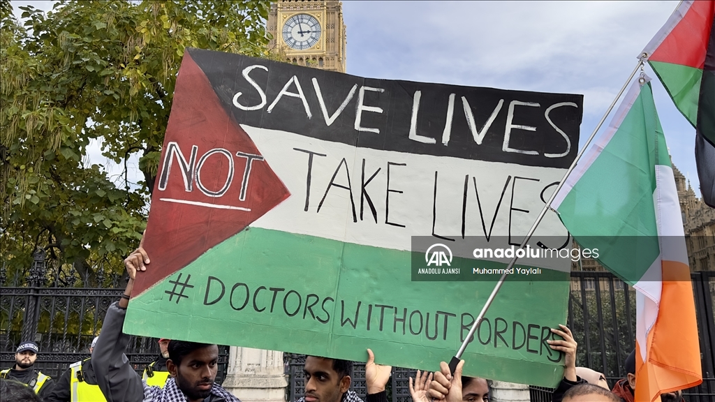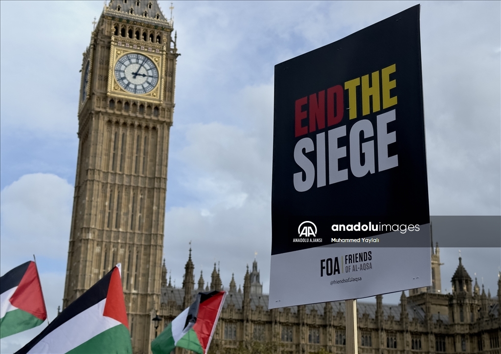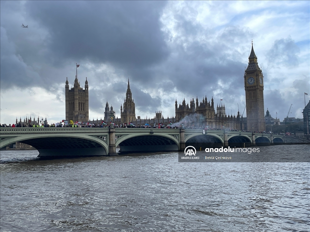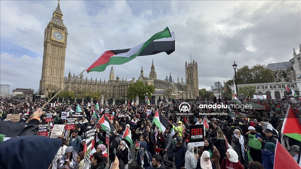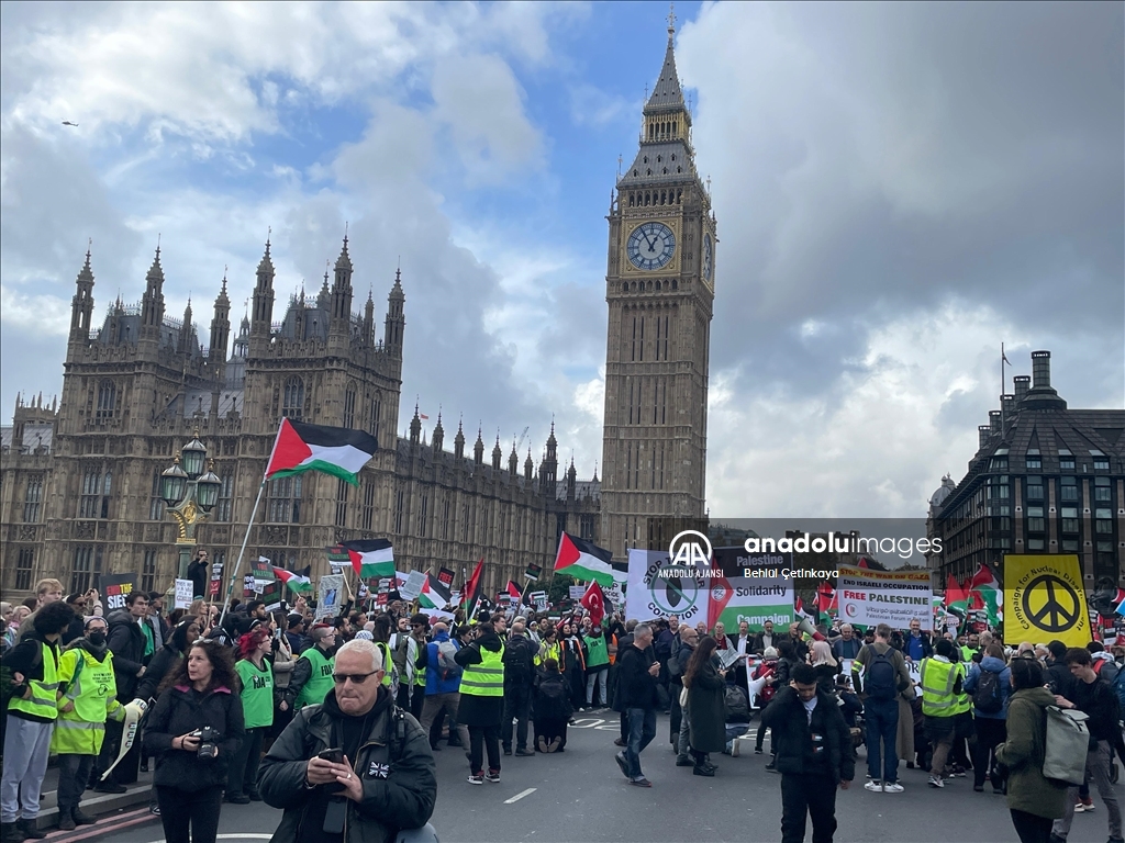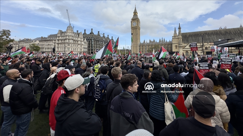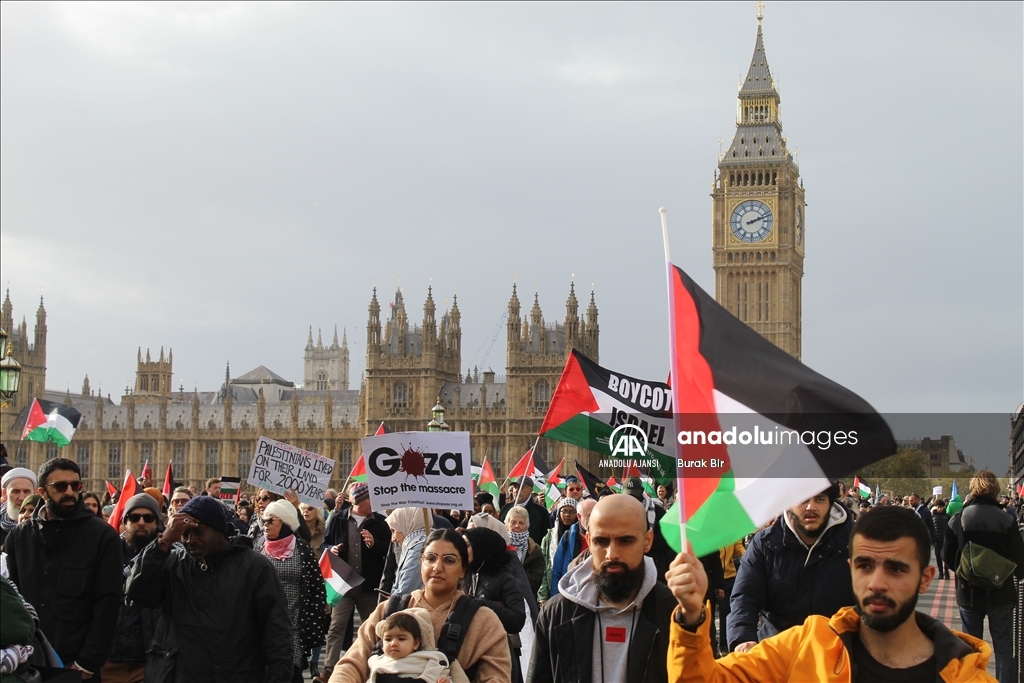 İngiltere'nin başkenti Londra'da Filistin'e destek gösterisi düzenledi. İngiltere Parlamentosu önündeki Parlamento Meydanı'nda toplanan yüzlerce gösterici, ellerinde pankartlar ve Filistin bayraklarıyla Filistin'e destek mesajı verdi. ( Behlül Çetinkaya - Anadolu Ajansı )Behlül Çetinkaya