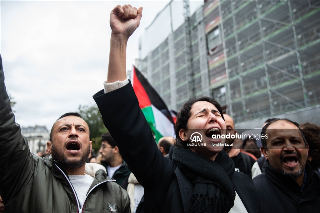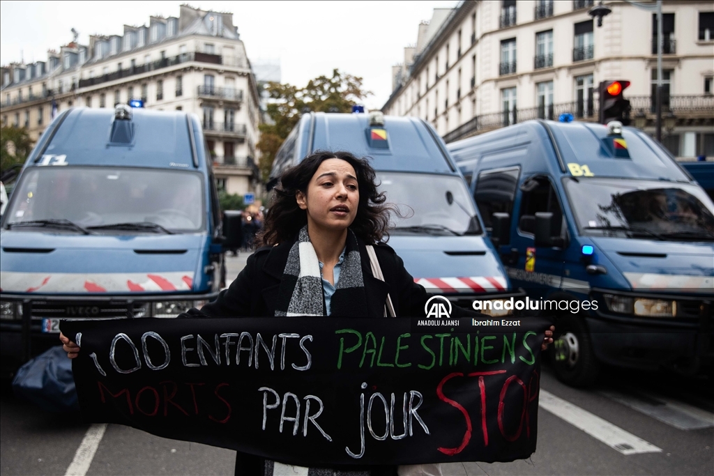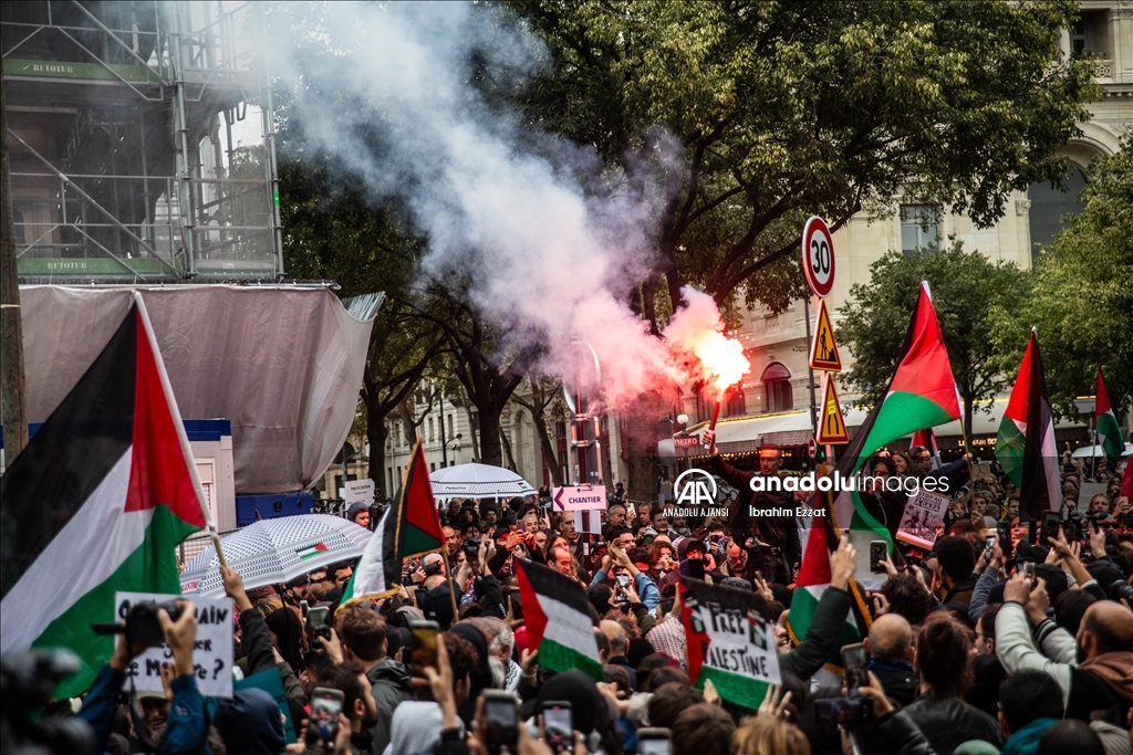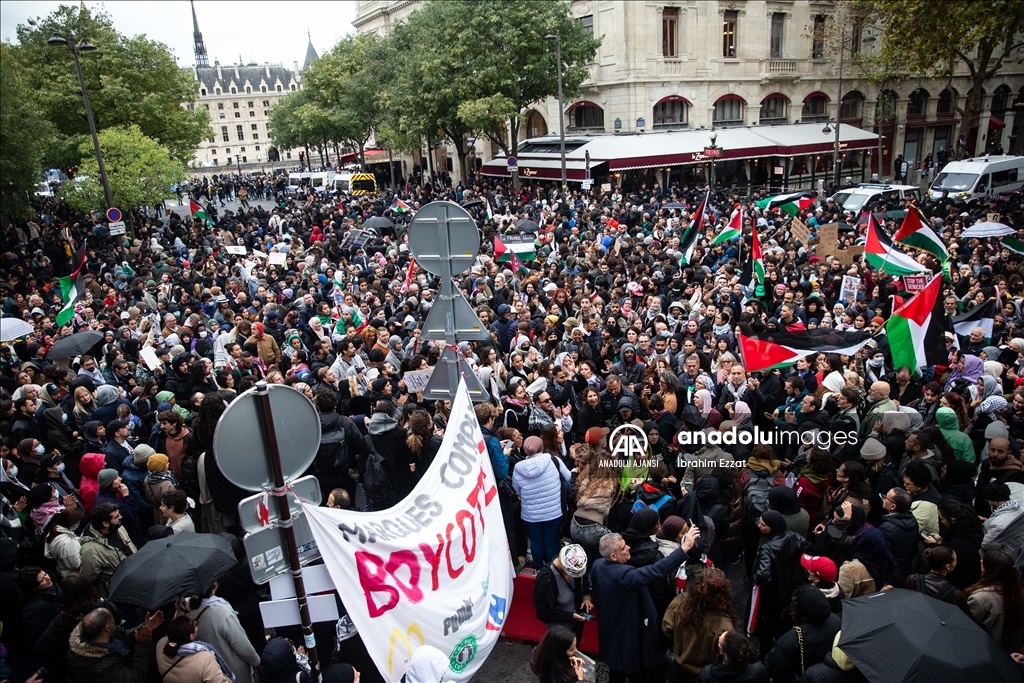 Fransa'nın başkenti Paris'te emniyet müdürlüğünün yasağına ve yağmura rağmen Filistin'e destek gösterisi düzenleniyor. Paris'te Chatelet Meydanı'nda yerel saat ile 14.30'da başlayan gösteri, polisin yoğun güvenlik önlemleri altında sürüyor. ( İbrahim Ezzat - Anadolu Ajansı )İbrahim Ezzat