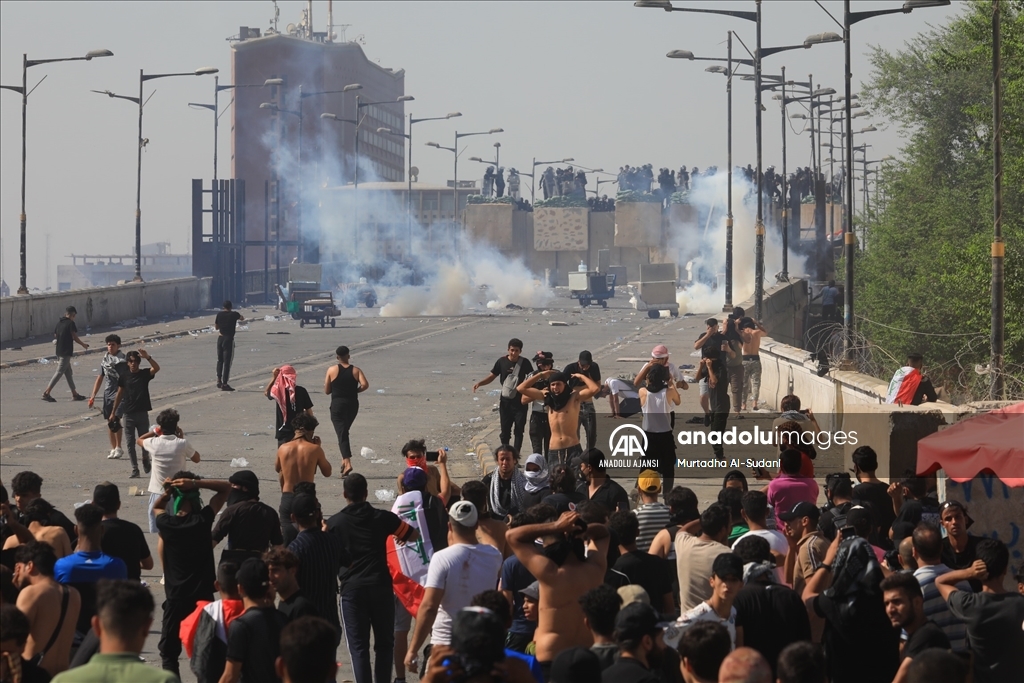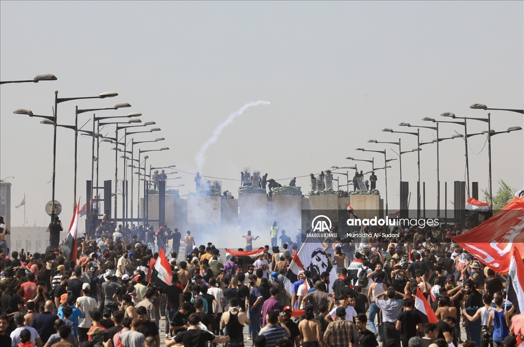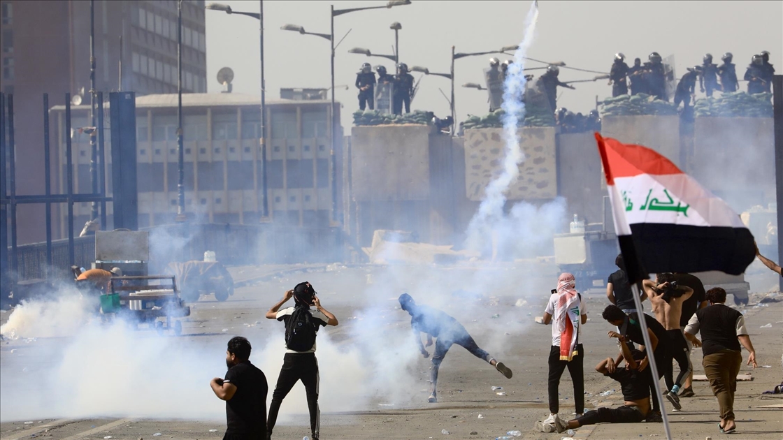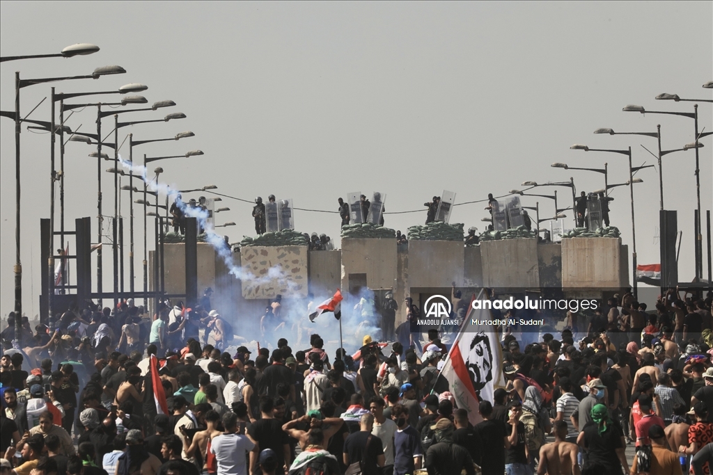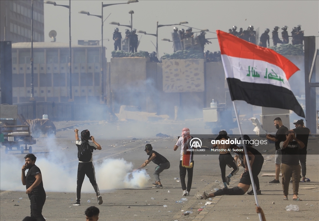 Irak’ın başkenti Bağdat’ta güvenlik güçleri, 1 Ekim 2019'daki kanlı hükümet karşıtı gösterilerin yıl dönümünde protesto eylemi gerçekleştiren gruba biber gazı ve ses bombalarıyla müdahalede bulunuyor. Irak hükümet güçleri, Bağdat’ın merkezi Tahrir Meydanı’ndaki Cumhuriyet Köprüsü’nde kurulan bariyerleri aşmaya çalışan göstericileri biber gazı ve ses bombaları ile dağıtmaya çalışıyor. ( Murtadha Al-Sudani - Anadolu Ajansı )Murtadha Al-Sudani