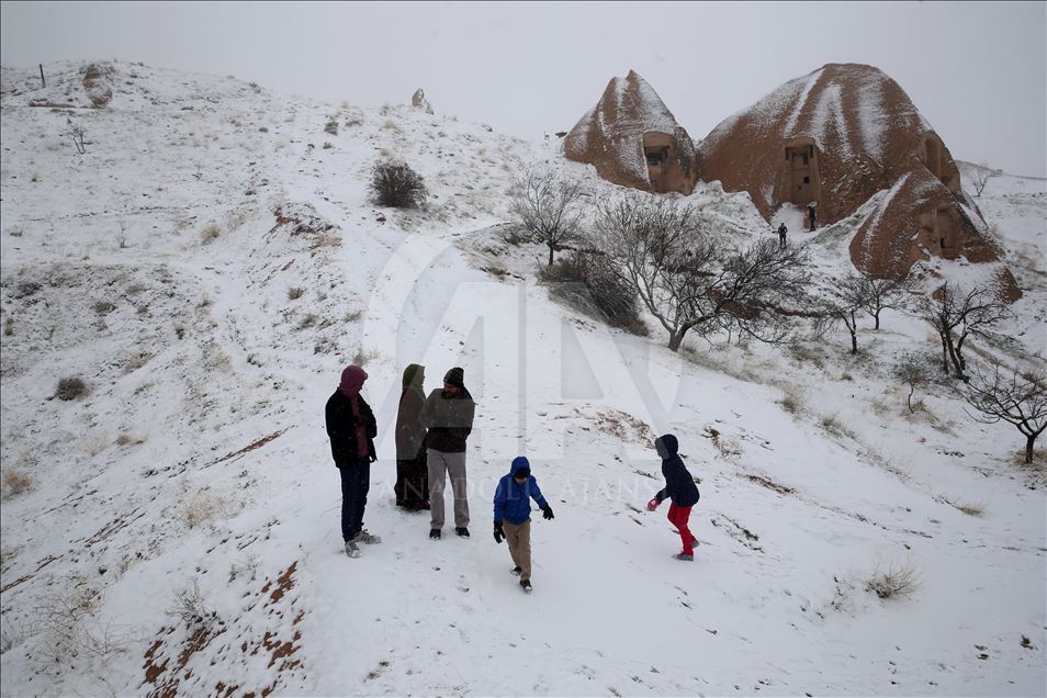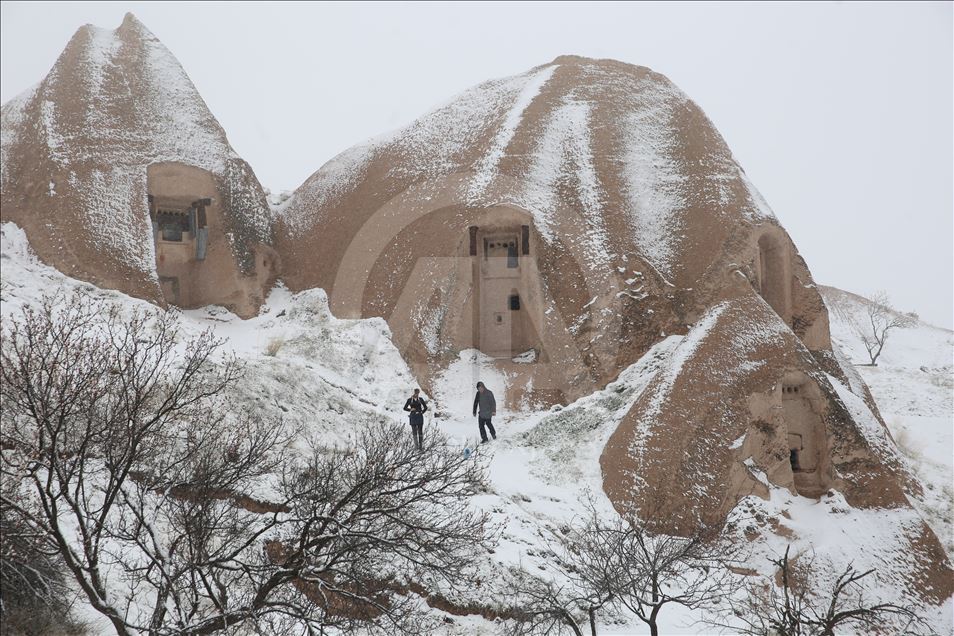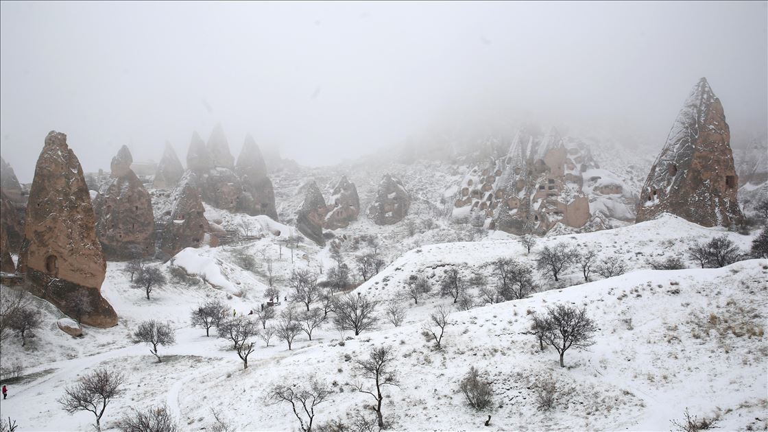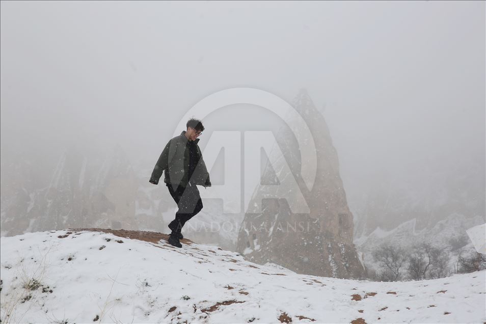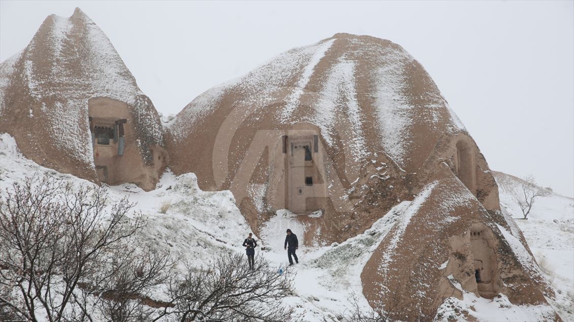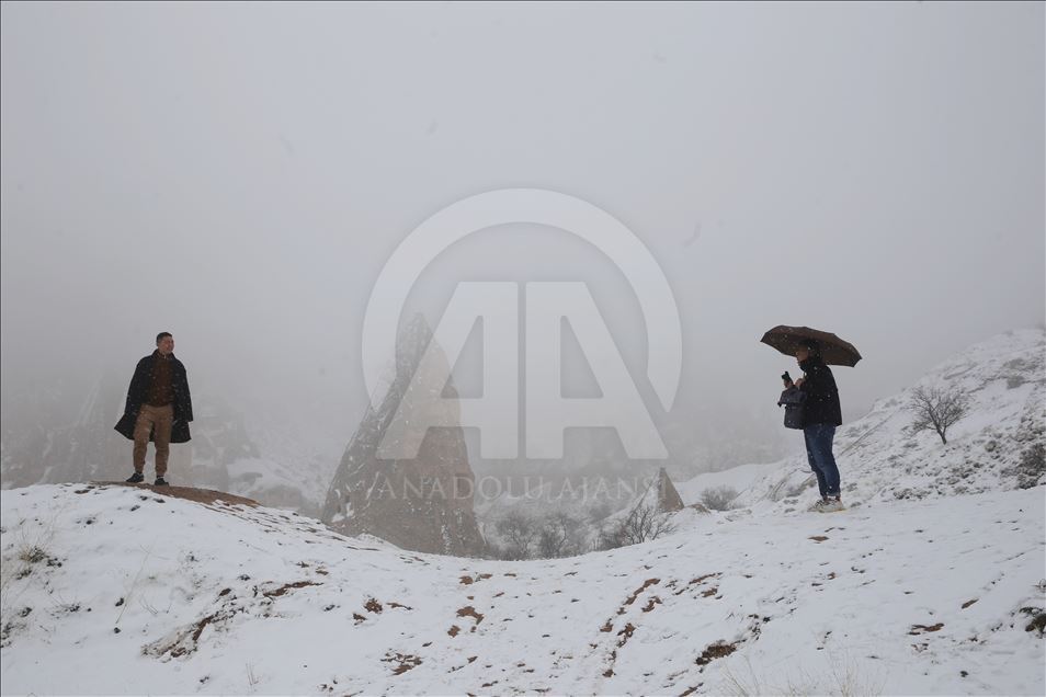 Kapadokya bölgesinde sabah erken saatlerde başlayan kar yağışının ardından peribacaları beyaz örtüyle kaplandı. Bölgede etkili olan kar yağışı, Türkiye'nin önemli turizm merkezlerinden Kapadokya'da, doğal kaya oluşumlarıyla kaplı vadileri beyaza bürüdü. Uçhisar, Göreme ve Paşabağı mevkisini ziyaret eden bazı turistler, karlı manzarada hatıra fotoğrafı çektirirken, bazıları da kar topu oynadı. ( Behçet Alkan - Anadolu Ajansı )Behçet Alkan