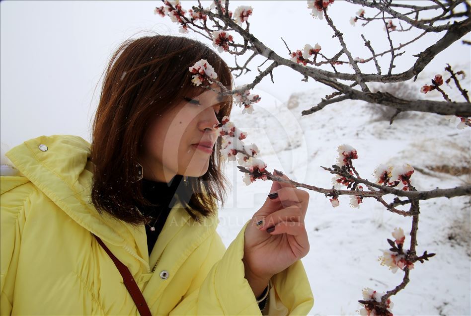 Kapadokya'da etkili olan ve peribacalarını beyaza bürüyen kar, erik ve kayısı ağaçlarının çiçekleri ile bölgeye farklı güzellik kattı.