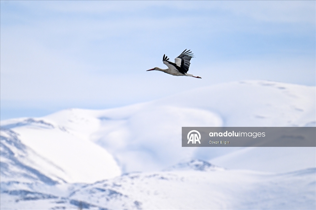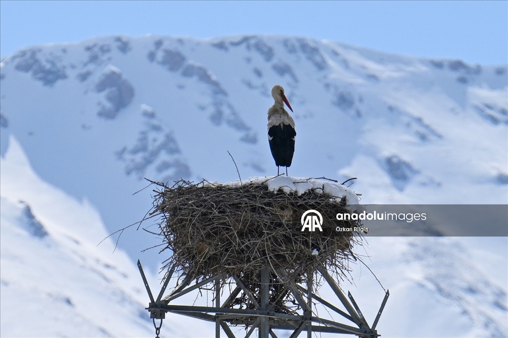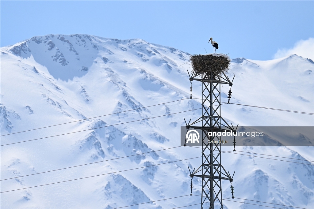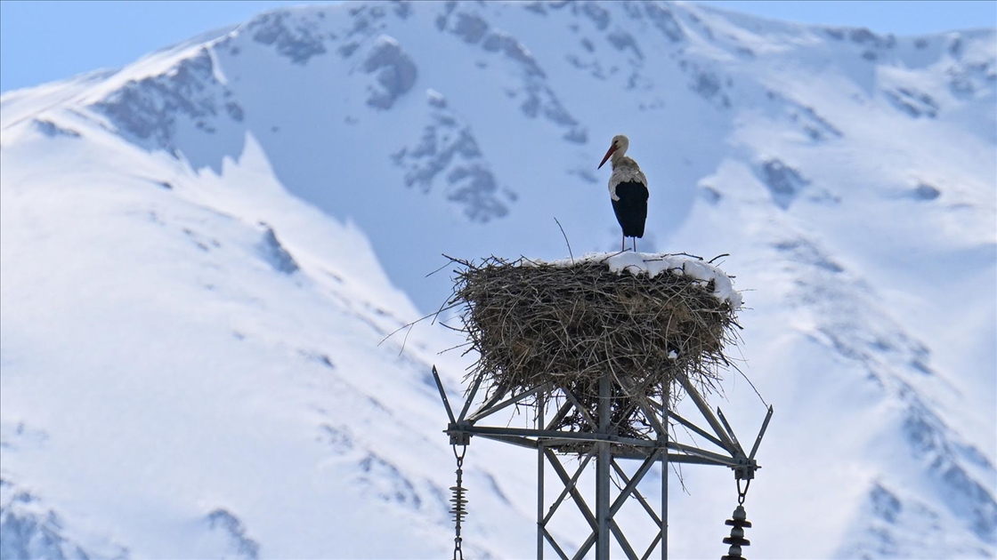 Soğuk havaya rağmen yuvasını terk etmeyen leylek, karlı Artos Dağı ile birlikte görüntülendi. (Özkan Bilgin - Anadolu Ajansı)Özkan Bilgin