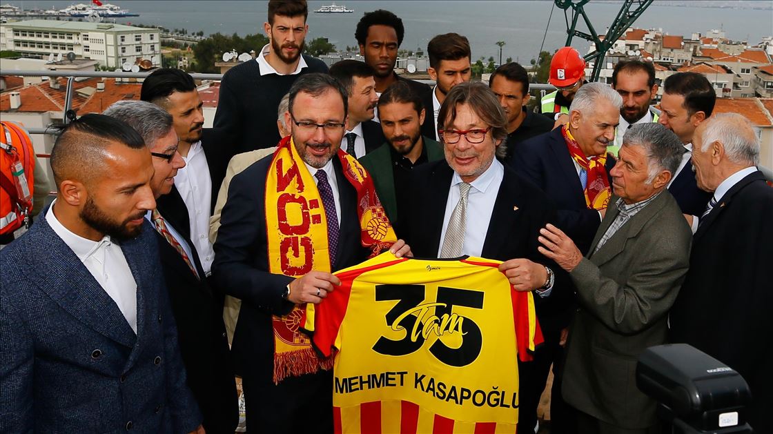 Gençlik ve Spor Bakanı Mehmet Muharrem Kasapoğlu ve AK Parti İzmir Milletvekili Binali Yıldırım, İzmir'de yapımı devam eden Alsancak Stadı ile Göztepe'nin stadı olan Gürsel Aksel Spor ve Sağlıklı Yaşam Merkezi'nde incelemelerde bulundu. Kasapoğlu ve Yıldırım, Göztepeli futbolcularla hatıra fotoğrafı çektirdi. ( Evren Atalay - Anadolu Ajansı )Evren Atalay