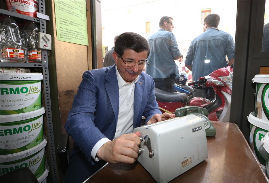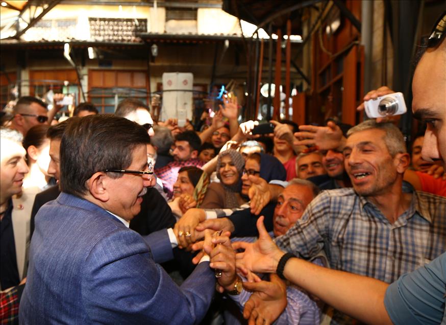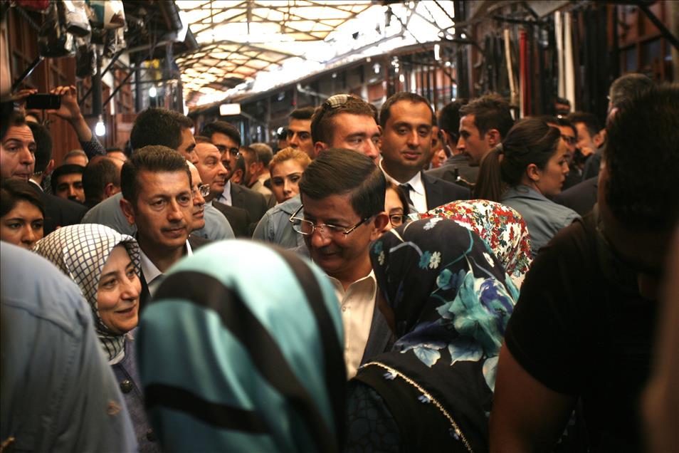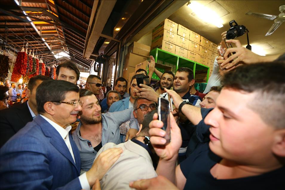AK Parti Genel Başkanı ve Başbakan Ahmet Davutoğlu, eşi Sare Davutoğlu ile Gaziantep'teki Elmacı Pazarı ve Bakırcılar Çarşısını gezdi. Davutoğlu, seçim otobüsünden halkı selamladı. (Kerem Kocalar - Anadolu Ajansı)Kerem Kocalar