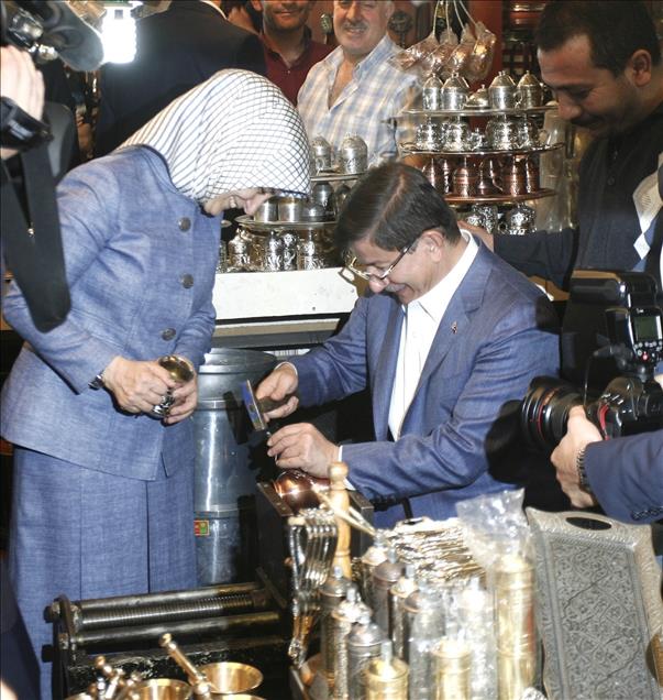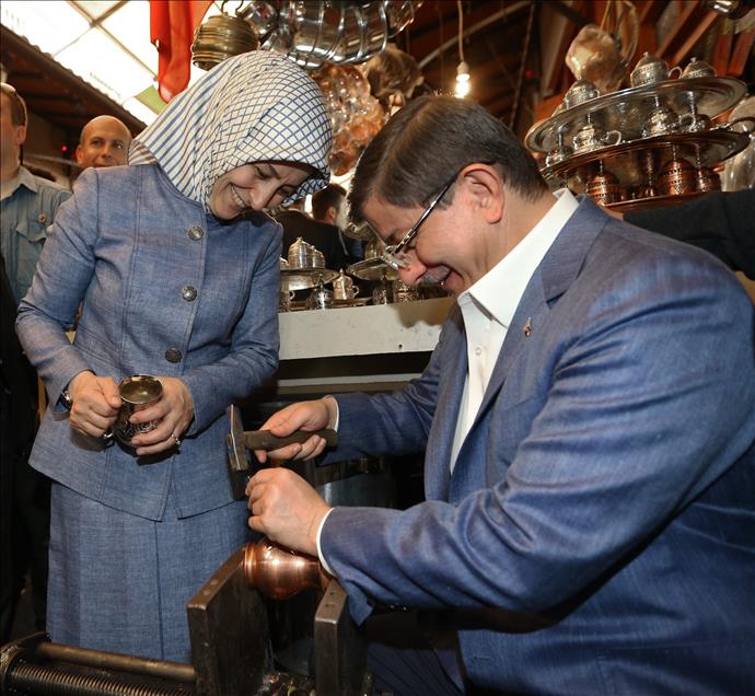 Başbakan Ahmet Davutoğlu, eşi Sare Davutoğlu ile Gaziantep'te Elmacı Pazarı ve Bakırcılar Çarşısını gezdi. Bakırcı esnafını ziyaret eden Davutoğlu bir dükkanda bakır işlemesi yaptı. (Ensar Özdemir - Anadolu Ajansı)Ensar Özdemir