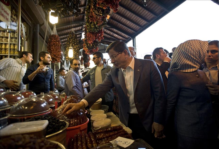 AK Parti Genel Başkanı ve Başbakan Ahmet Davutoğlu, eşi Sare Davutoğlu ile Gaziantep'teki Elmacı Pazarı ve Bakırcılar Çarşısını gezdi. (Halil Sağırkaya - Anadolu Ajansı)Halil Sağırkaya