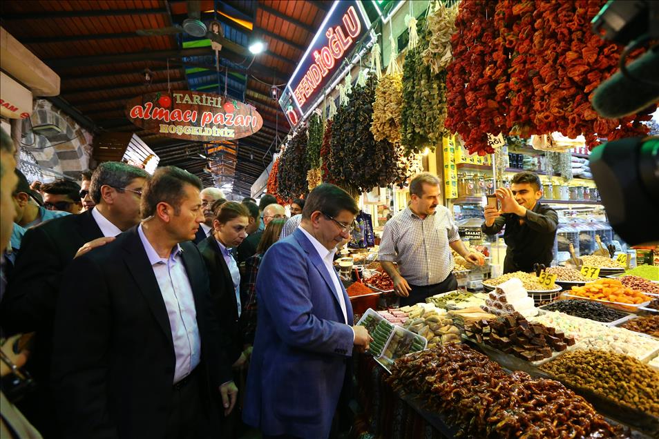 Başbakan Ahmet Davutoğlu, eşi Sare Davutoğlu ile Gaziantep'te Elmacı Pazarı ve Bakırcılar Çarşısını gezdi. Vatandaşlarla sohbet eden Davutoğlu, çarşı esnafını ziyaret etti. (Ensar Özdemir - Anadolu Ajansı)Ensar Özdemir