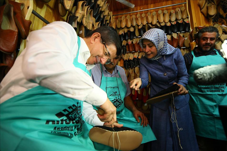 AK Parti Genel Başkanı ve Başbakan Ahmet Davutoğlu, eşi Sare Davutoğlu ile Gaziantep'teki Elmacı Pazarı ve Bakırcılar Çarşısını gezdi. Davutoğlu, önlük giyerek çarık yapımı hakkında bilgi aldı. (Hakan Göktepe - Anadolu Ajansı)Hakan Göktepe