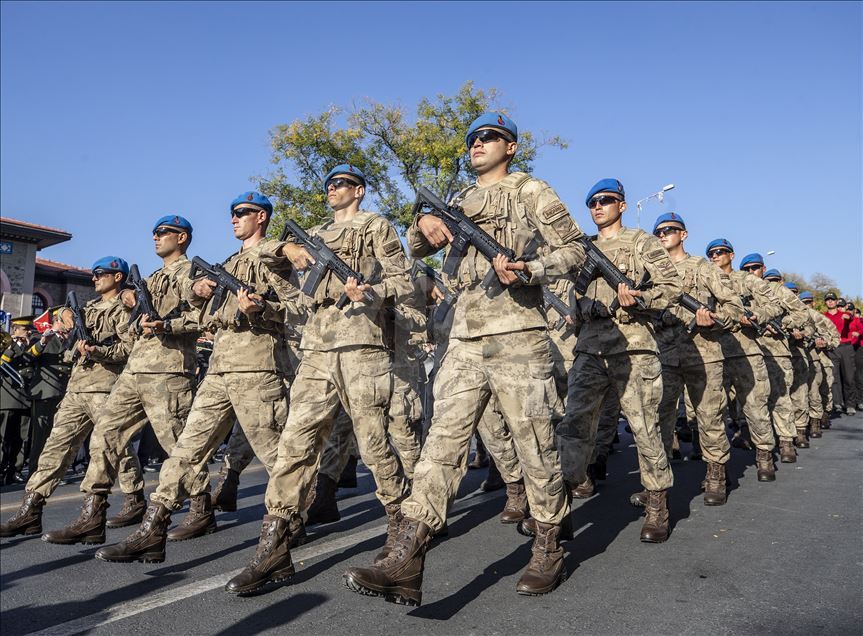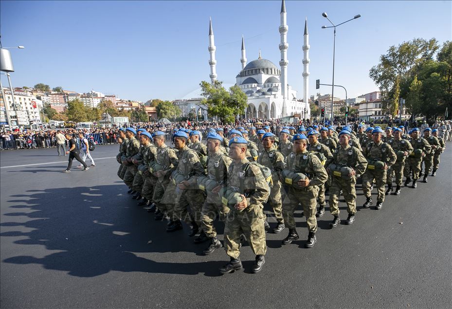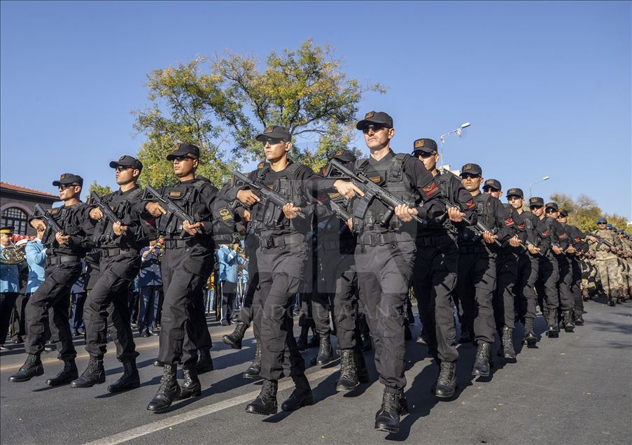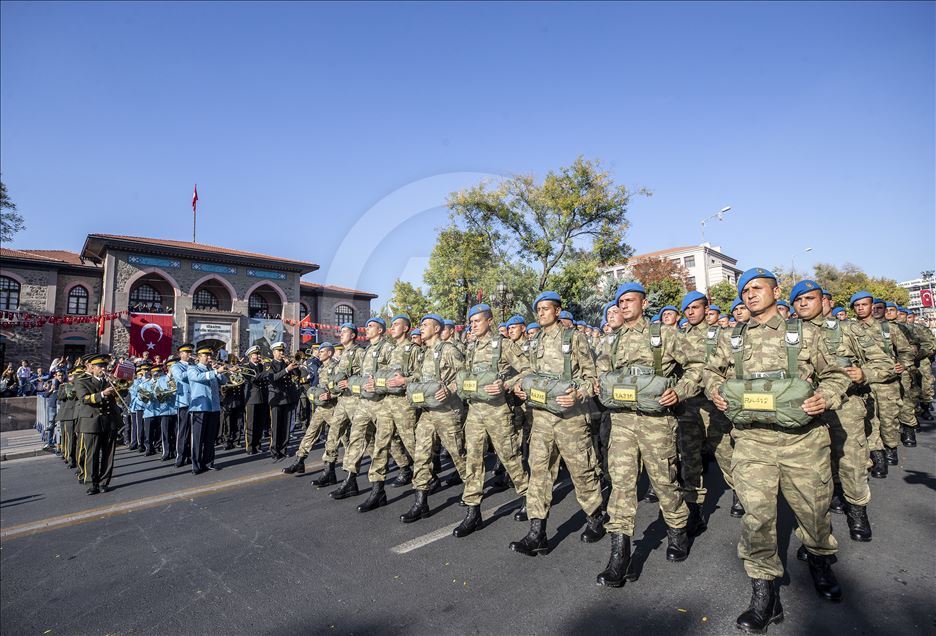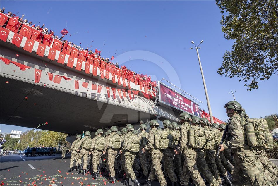 29 Ekim Cumhuriyet Bayramı dolayısıyla Türkiye Büyük Millet Meclisi (TBMM) önünden Ulus'taki ilk Meclis binasına kadar "kortej yürüyüşü" düzenlendi. Kortej yürüşünü Opera Köprüsü üzerinden izleyen bazı vatandaşlar da komandoların geçtiği güzergaha karanfil bıraktı. ( Ali Balıkçı - Anadolu Ajansı )Ali Balıkçı
