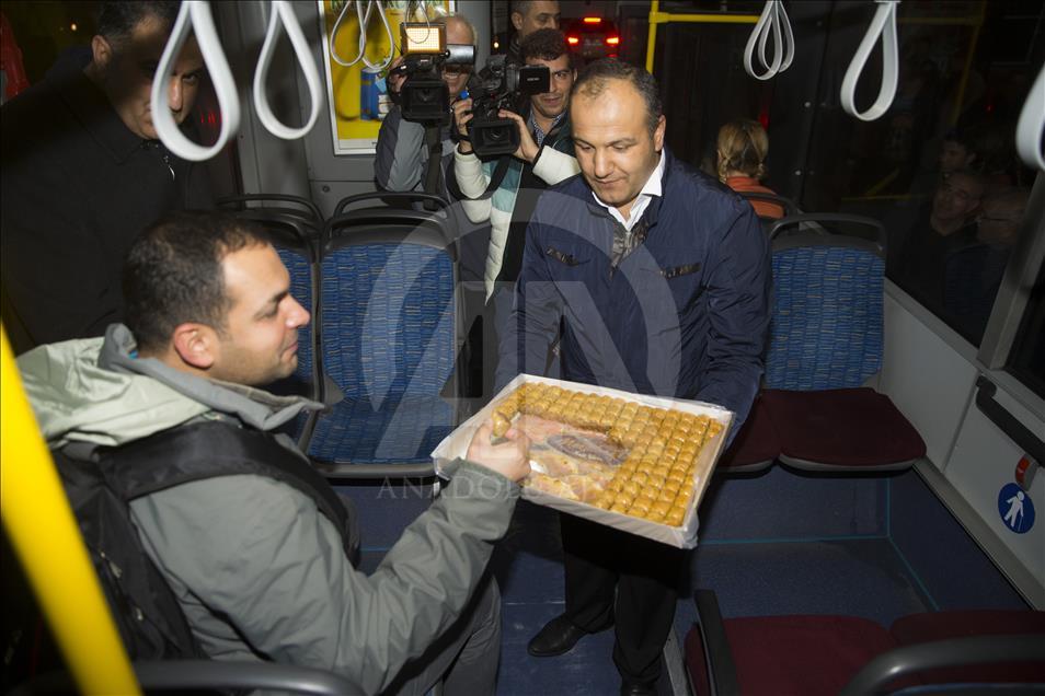 Ankara'da, Büyükşehir Belediye Başkanı Mustafa Tuna'nın talimatıyla EGO otobüslerinin gece saatlerinde de hizmet verme uygulaması 35 hatta, 280 sefer ile başladı. Kızılay'da gazetecilerle gece yarısı bir araya gelen EGO Genel Müdürü Balamir Gündoğdu, gazetecilere açıklamalarda bulundu. Ankara Büyükşehir Belediye Başkanı Mustafa Tuna'nın EGO şoförlerine, gazetecilere ve yolculara tatlı ikramının olduğunu söyleyen Gündoğdu, durağa gelen otobüslerin şoförlerine, gazetecilere ve yolculara tatlı dağıttı. ( Mustafa Kamacı - Anadolu Ajansı )Mustafa Kamacı