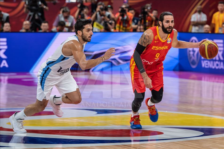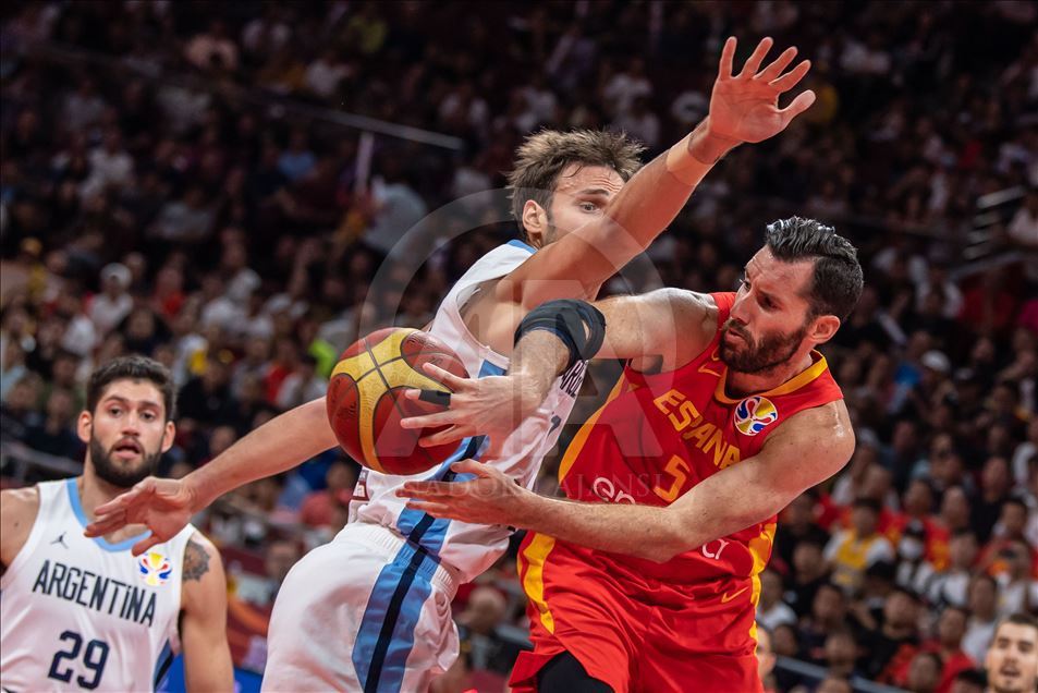 İspanya ve Arjantin Basketbol Milli takımları, Çin'in ev sahipliğinde gerçekleştirilen 2019 FIBA Dünya Kupası final maçında karşılaştı. Bir pozisyonda İspanyol oyuncu Ricky Rubio (9) rakibi ile mücadele etti.