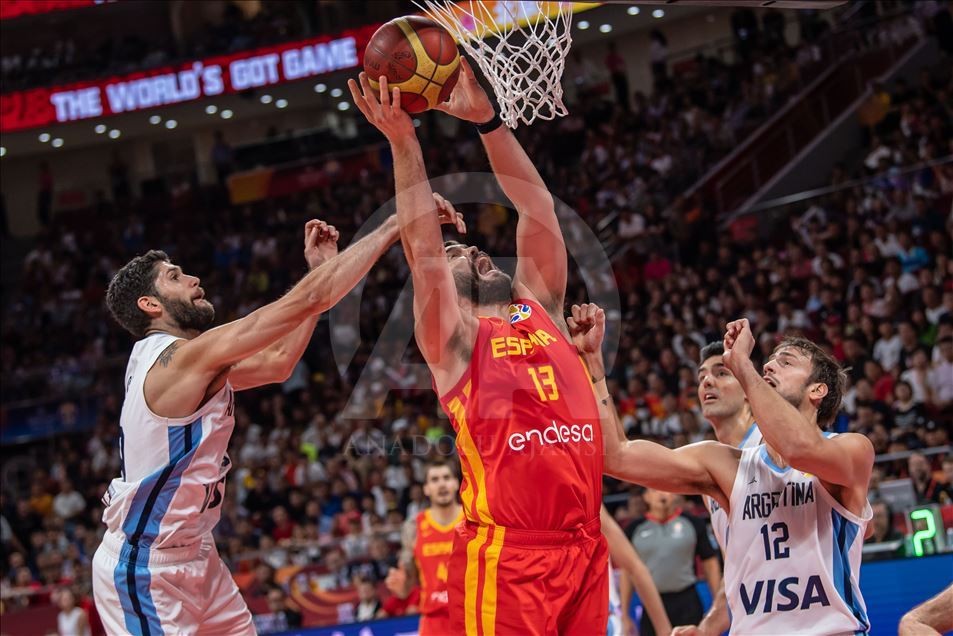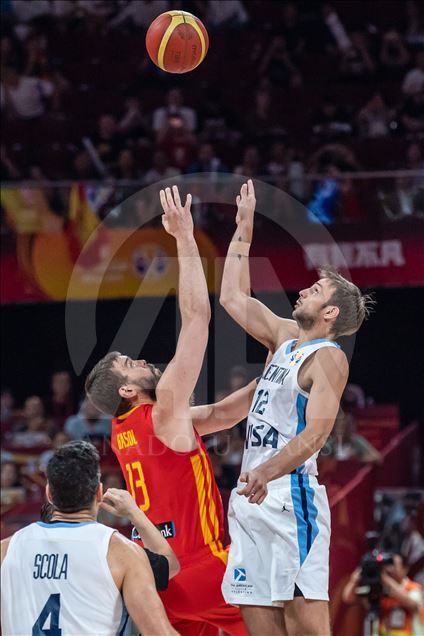 İspanya ve Arjantin Basketbol Milli takımları, Çin'in ev sahipliğinde gerçekleştirilen 2019 FIBA Dünya Kupası final maçında karşılaştı. Bir pozisyonda İspanyol oyuncu Marc Gasol (13) rakibi Marcos Delia (12) ile mücadele etti.