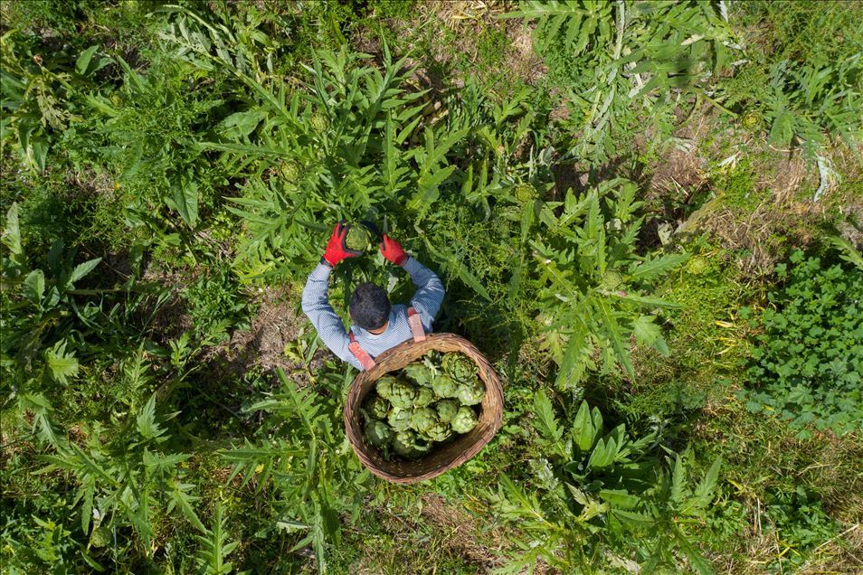 Türkiye'nin bereketli topraklarında hububat, sebze ve meyve üreterek hem yurdun hem de dünyanın birçok ülkesinin gıda ihtiyacını karşılayan çiftçiler bugünlerde yoğun bir telaş yaşıyor. Fotoğrafta İzmir'deki sakız enginarı bahçesi görülüyor. ( Ömer Evren Atalay - Anadolu Ajansı )Ömer Evren Atalay