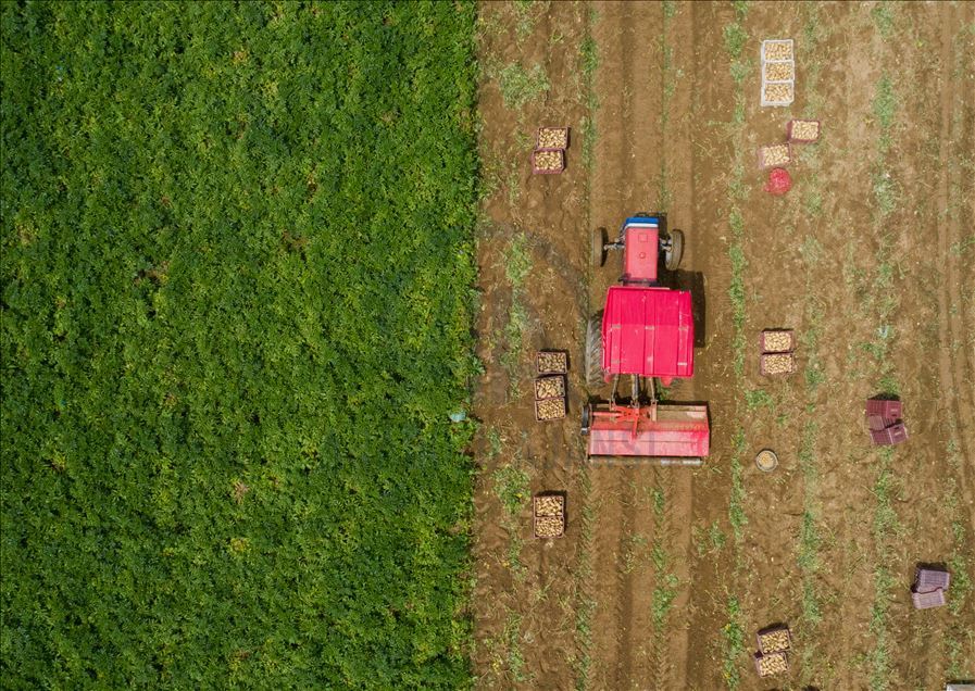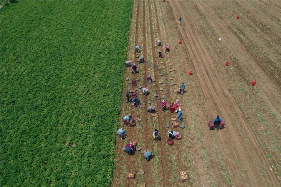 Türkiye'nin bereketli topraklarında hububat, sebze ve meyve üreterek hem yurdun hem de dünyanın birçok ülkesinin gıda ihtiyacını karşılayan çiftçiler bugünlerde yoğun bir telaş yaşıyor. Fotoğrafta İzmir'deki patates hasadı görülüyor. ( Ömer Evren Atalay - Anadolu Ajansı )Ömer Evren Atalay