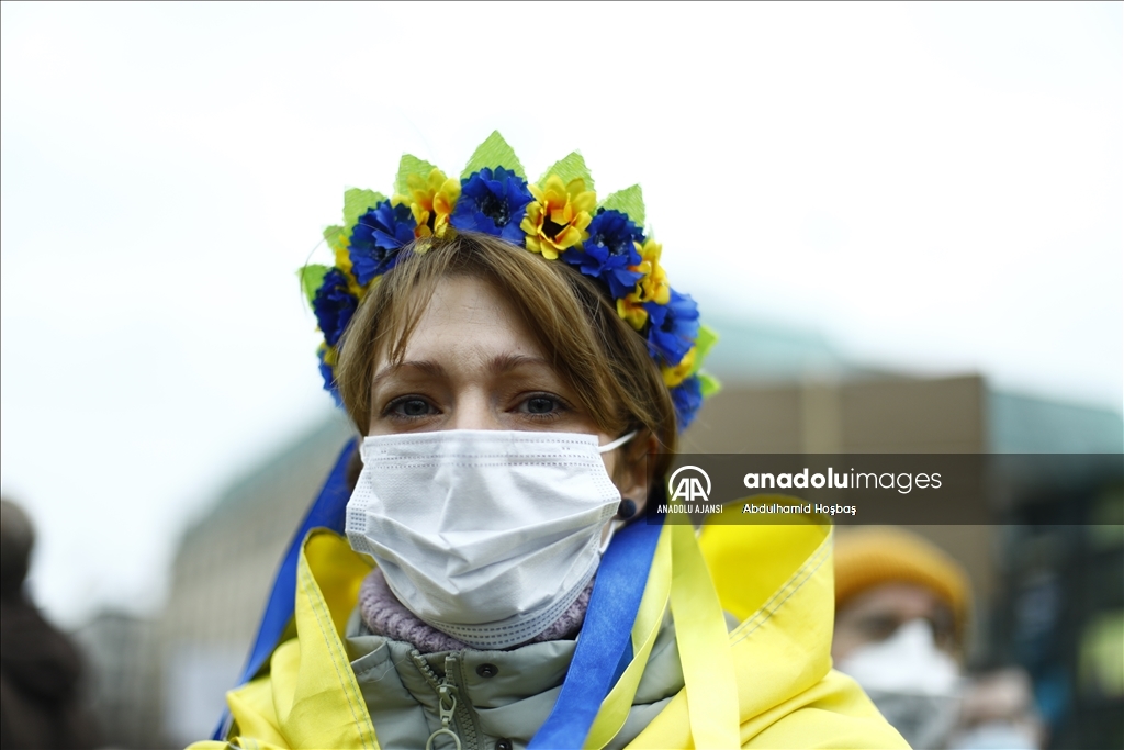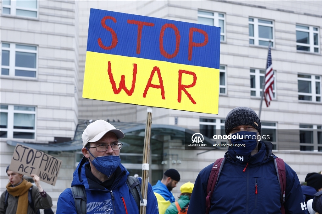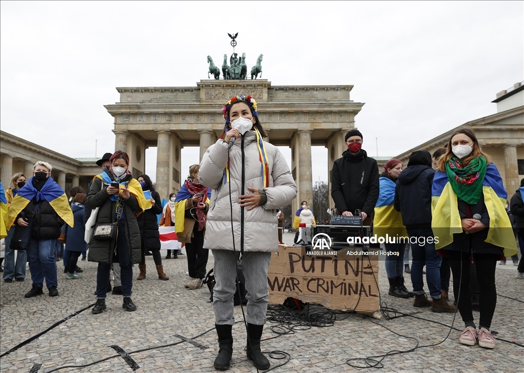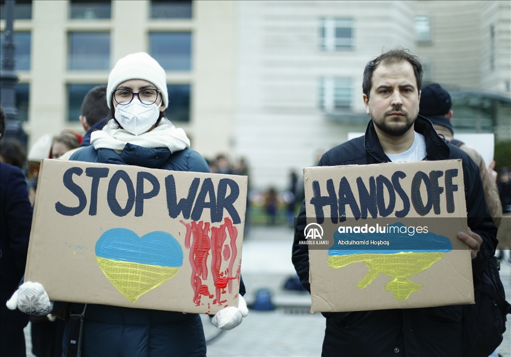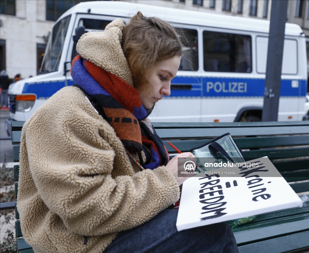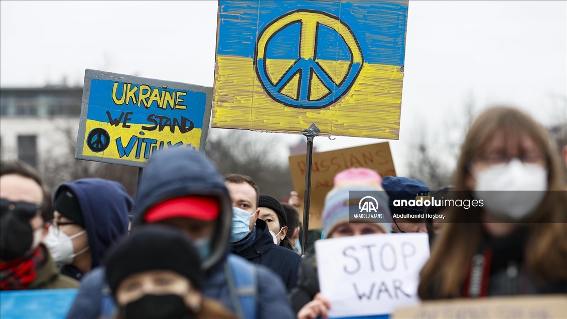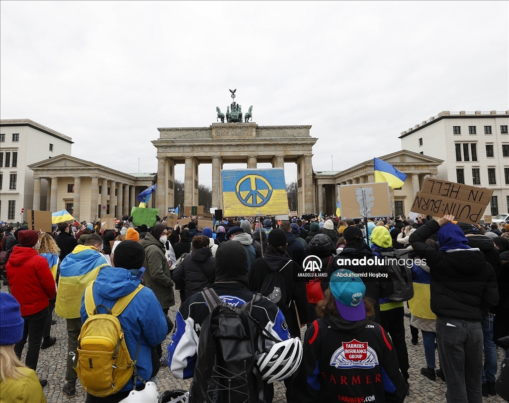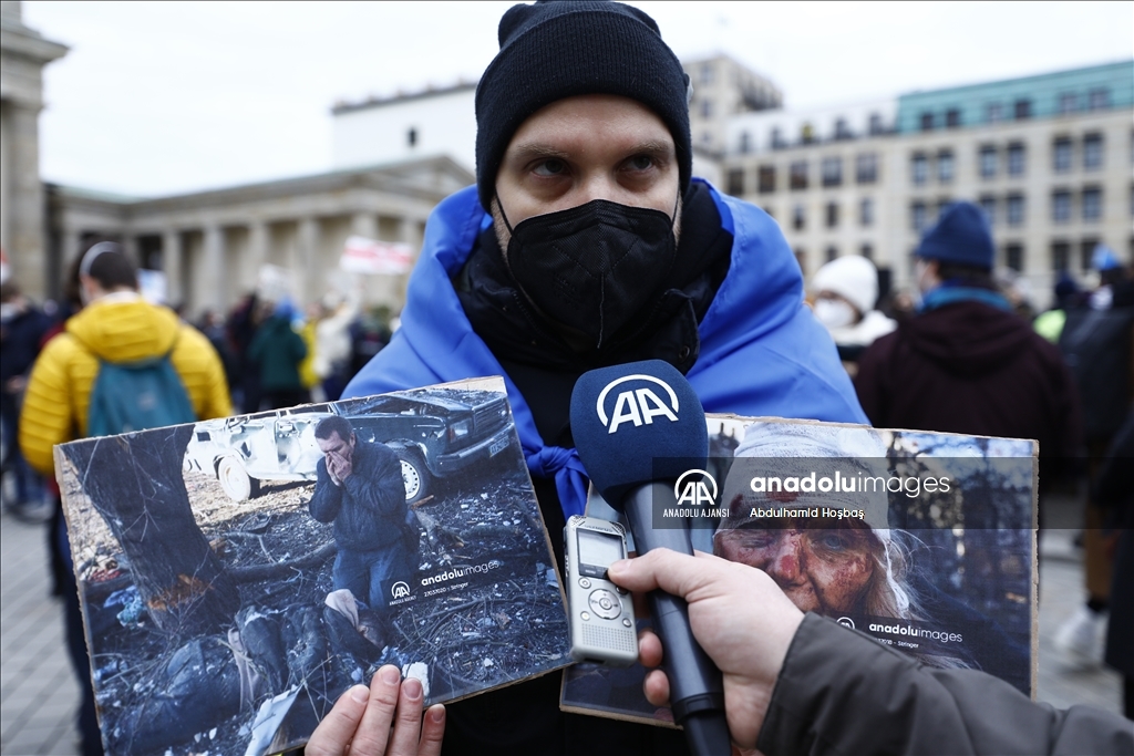 Almanya'nın başkenti Berlin'de, Rusya'nın Ukrayna'ya askeri müdahalesi protesto edildi. Göstericilerden biri, Anadolu Ajansı tarafından hava saldırısı sonrası Ukrayna'da çekilen fotoğrafları protestoda kullandı.