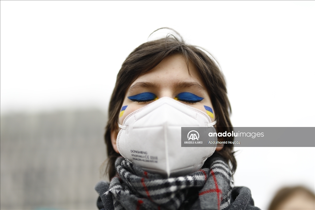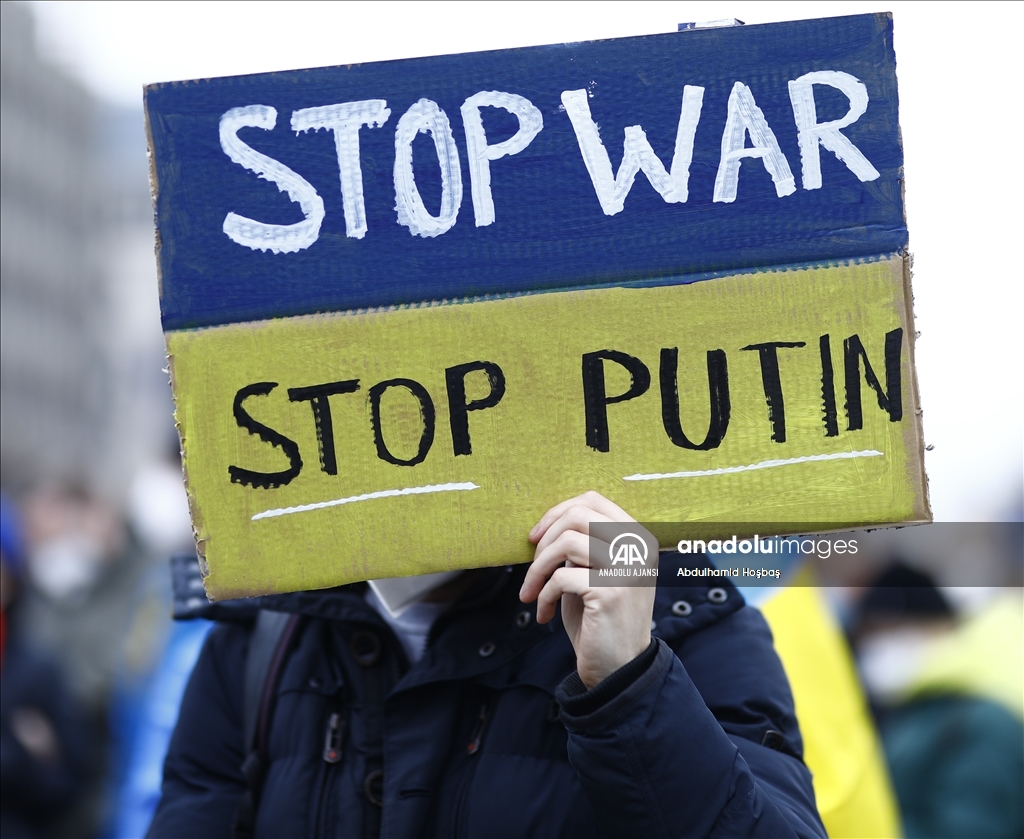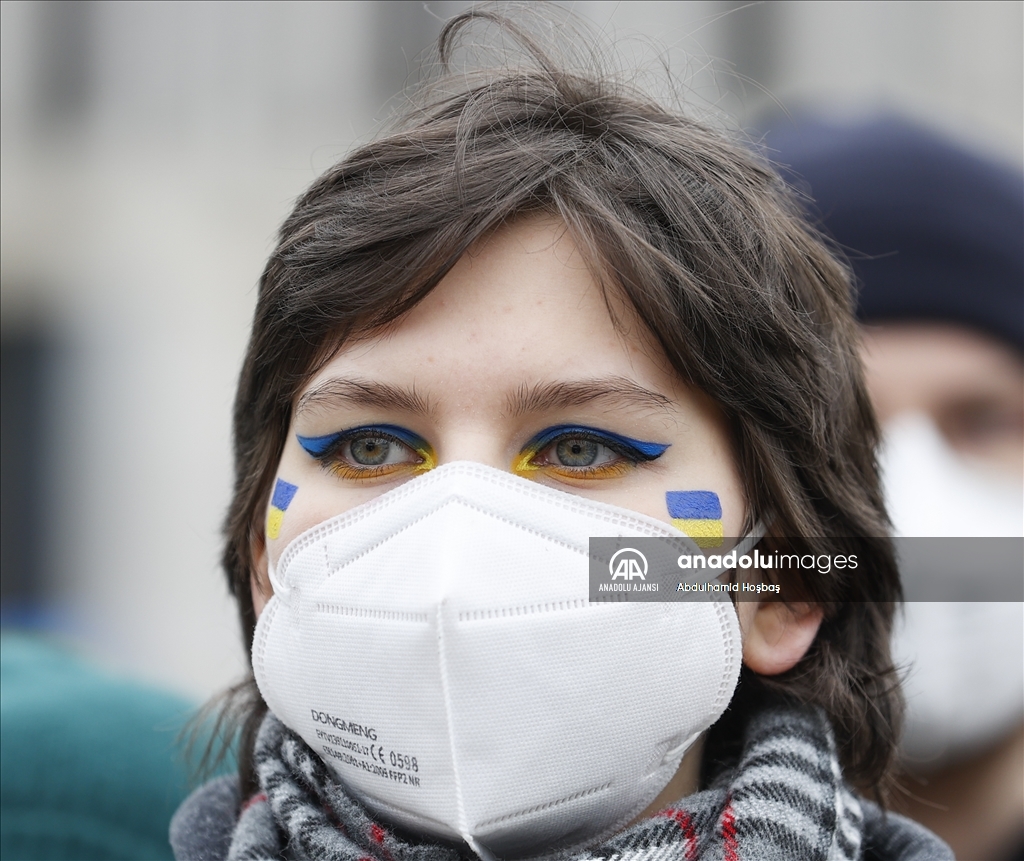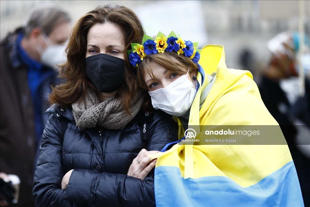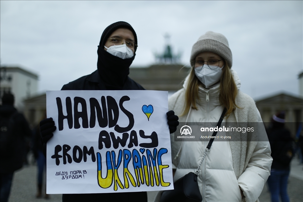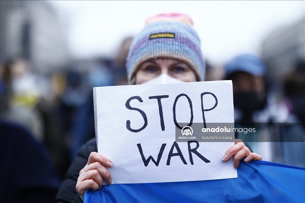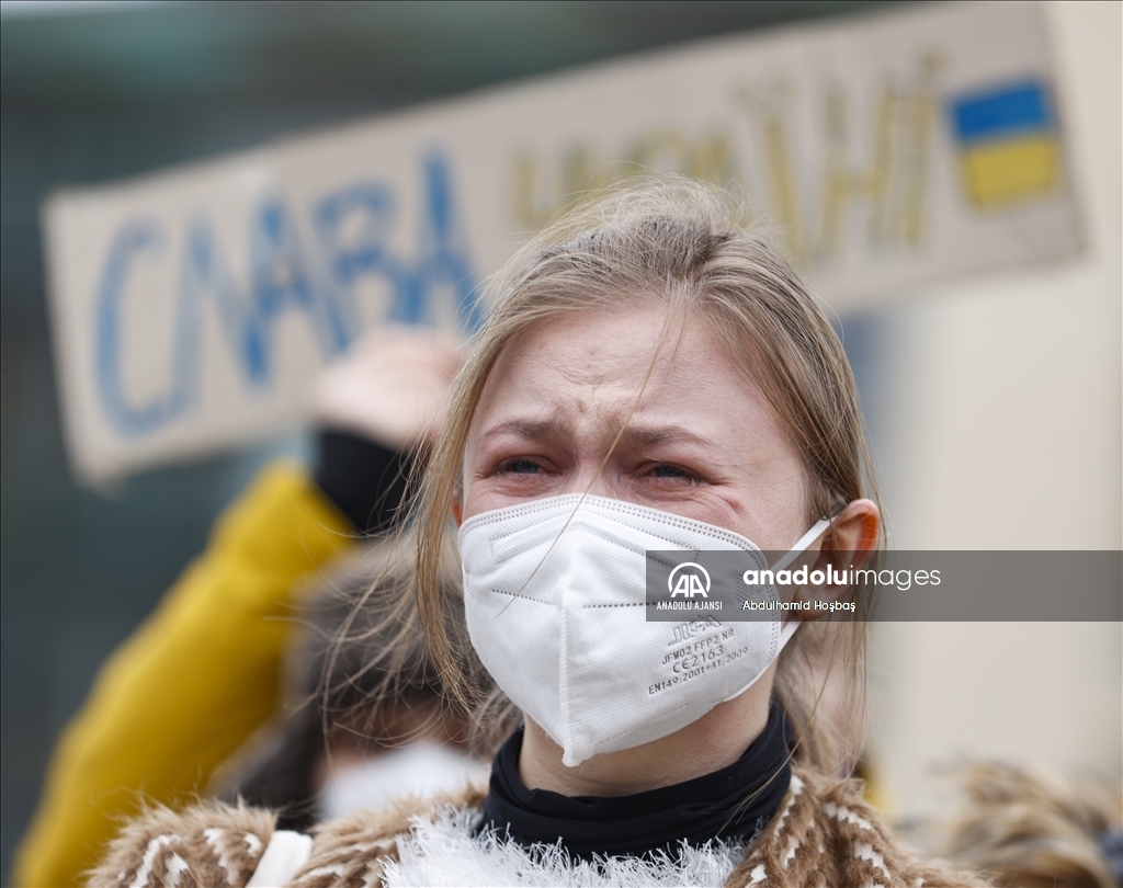 Almanya'nın başkenti Berlin'de, Rusya'nın Ukrayna'ya askeri müdahalesi protesto edildi. Göstericilerden biri, Anadolu Ajansı tarafından hava saldırısı sonrası Ukrayna'da çekilen fotoğrafları protestoda kullandı.
