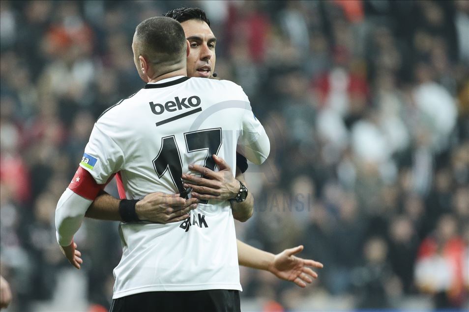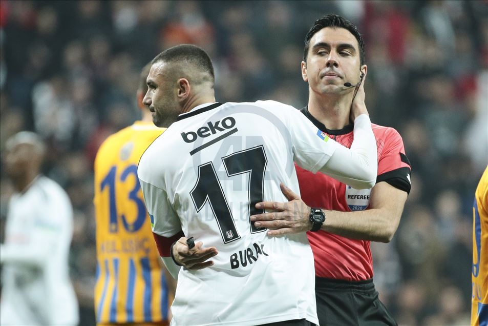 Beşiktaş, Süper Lig'in 25. hafta maçında MKE Ankaragücü ile Vodafone Park'ta karşılaştı. Beşiktaşlı oyuncu Burak Yılmaz (17), bir pozisyonda önünde kalan mücadelenin hakemi Arda Kardeşler'le çarpıştı. ( Serhat Çağdaş - Anadolu Ajansı )Serhat Çağdaş