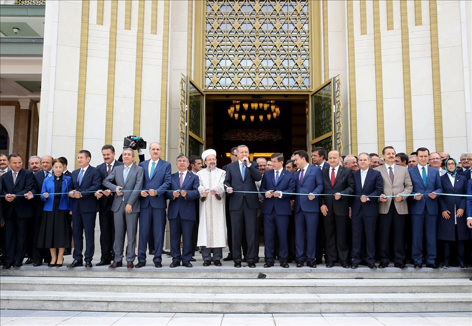 Cumhurbaşkanı Recep Tayyip Erdoğan, Cumhurbaşkanlığı Külliyesi içinde yer alan Beştepe Millet Camisi'nin açılışına katıldı. Cumhurbaşkanı Erdoğan, açılış kurdelesini, TBMM Başkanı İsmet Yılmaz, Başbakan Ahmet Davutoğlu, Başbakan Yardımcıları Yalçın Akdoğan, Numan Kurtulmuş ve Ali Babacan, Adalet Bakanı Kenan İpek, Kalkınma Bakanı Cevdet Yılmaz, Çevre ve Şehircilik Bakanı İdris Güllüce, Gıda, Tarım ve Hayvancılık Bakanı Mehdi Eker, Gümrük ve Ticaret Bakanı Nurettin Canikli, Bilim, Sanayi ve Teknoloji Bakanı Fikri Işık, Aile ve Sosyal Politikalar Bakanı Ayşenur İslam, Ekonomi Bakanı Nihat Zeybekci, Diyanet İşleri Başkanı Prof. Mehmet Görmez ve bazı milletvekilleri ile birlikte kesti. (Mehmet Ali Özcan - Anadolu Ajansı)Mehmet Ali Özcan