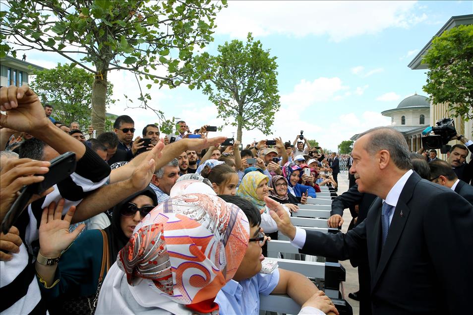 Cumhurbaşkanı Recep Tayyip Erdoğan, Cumhurbaşkanlığı Külliyesi içinde yer alan Beştepe Millet Camisi'nin açılışına katıldı. Cumhurbaşkanı Erdoğan, açılışa katılan vatandaşları selamladı. (Kayhan Özer - Anadolu Ajansı)Kayhan Özer