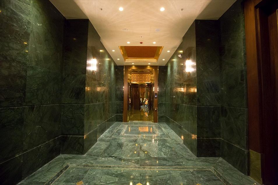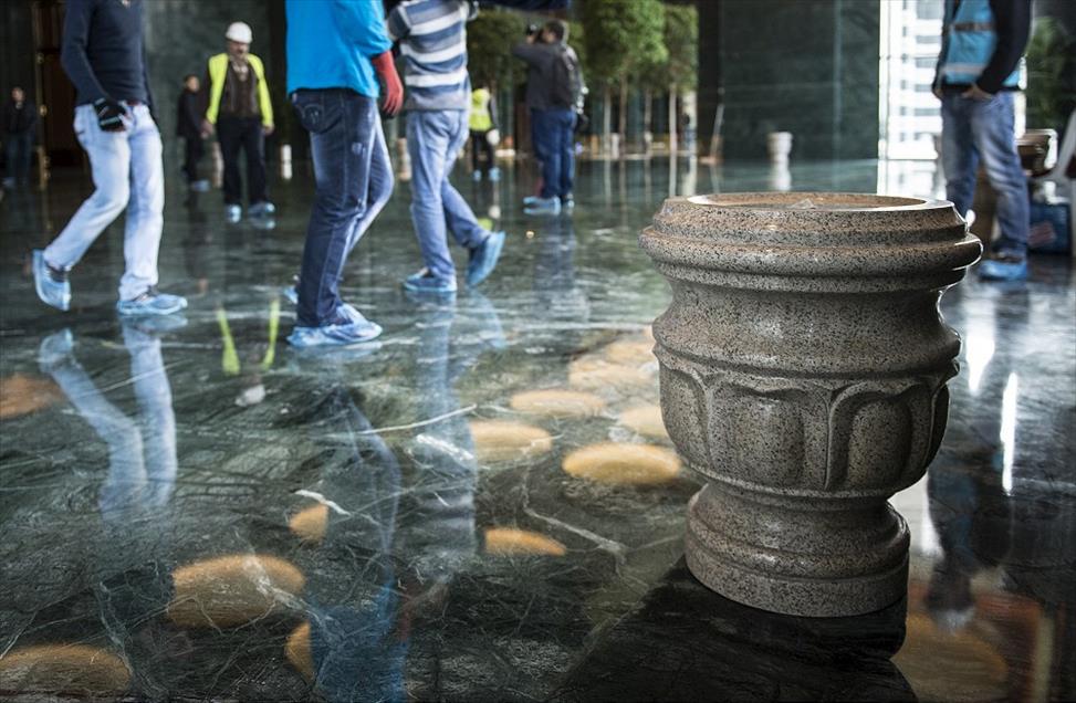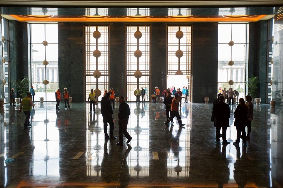 Beştepe'deki yeni Cumhurbaşkanlığı yerleşkesi, ilk kez 29 Ekim kutlamaları için kullanılacak. Tebrikleri Beştepe'de kabul edecek Cumhurbaşkanı recep Tayyip Erdoğan, akşam da eşi Emine Erdoğan ile Cumhuriyet Bayramı resepsiyonuna ev sahipliği yapacak. Resepsiyonun yapılacağı fuaye alanı ilk kez AA tarafından görüntülendi. Yer ve duvar kaplamalarında yeşil ve bordo granit kullanılan, yüksek tavanı dikkat çeken alan, ana binanın arka kısmında yer alıyor. Büyük bir süs havuzunun olduğu bahçeye üç büyük kapıyla açılan ve 20 büyük ağaçla süslenen alanda, küçük kubbe şeklinde 35 aydınlatma bulunuyor. Yeşil granit duvar ve yer kaplamalarının aralarındaki pirinç şerit levha süslemeler ile kapıların üzerinde, Selçuklu süsleme sanatında yer alan yıldız figürü fuaye alanında dikkati çeken ayrıntılar oldu. (Aykut Ünlüpınar - Anadolu Ajansı)Aykut Ünlüpınar