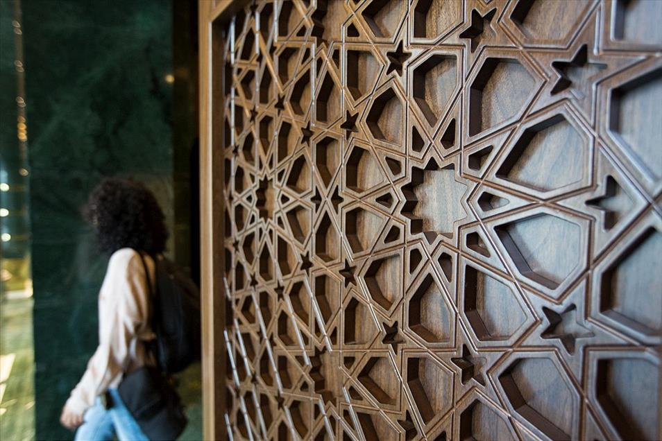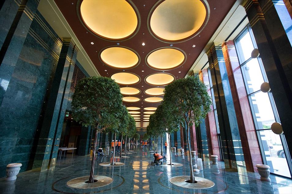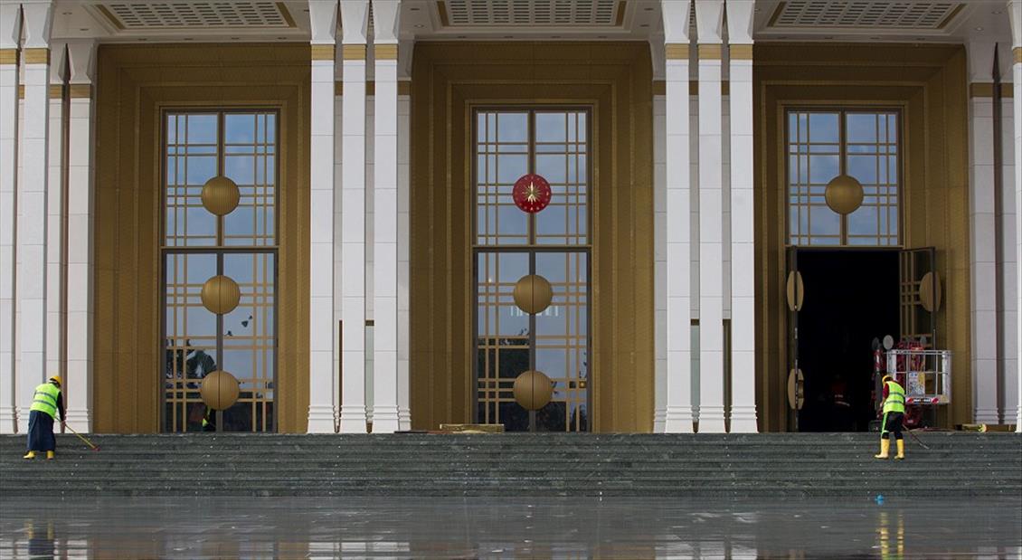 Beştepe'deki yeni Cumhurbaşkanlığı yerleşkesi, ilk kez 29 Ekim kutlamaları için kullanılacak. Tebrikleri Beştepe'de kabul edecek Cumhurbaşkanı recep Tayyip Erdoğan, akşam da eşi Emine Erdoğan ile Cumhuriyet Bayramı resepsiyonuna ev sahipliği yapacak. Resepsiyonun yapılacağı fuaye alanı ilk kez AA tarafından görüntülendi. Yer ve duvar kaplamalarında yeşil ve bordo granit kullanılan, yüksek tavanı dikkat çeken alan, ana binanın arka kısmında yer alıyor. Büyük bir süs havuzunun olduğu bahçeye üç büyük kapıyla açılan ve 20 büyük ağaçla süslenen alanda, küçük kubbe şeklinde 35 aydınlatma bulunuyor. Yeşil granit duvar ve yer kaplamalarının aralarındaki pirinç şerit levha süslemeler ile kapıların üzerinde, Selçuklu süsleme sanatında yer alan yıldız figürü fuaye alanında dikkati çeken ayrıntılar oldu. (Özge Elif Kızıl - Anadolu Ajansı)Özge Elif Kızıl