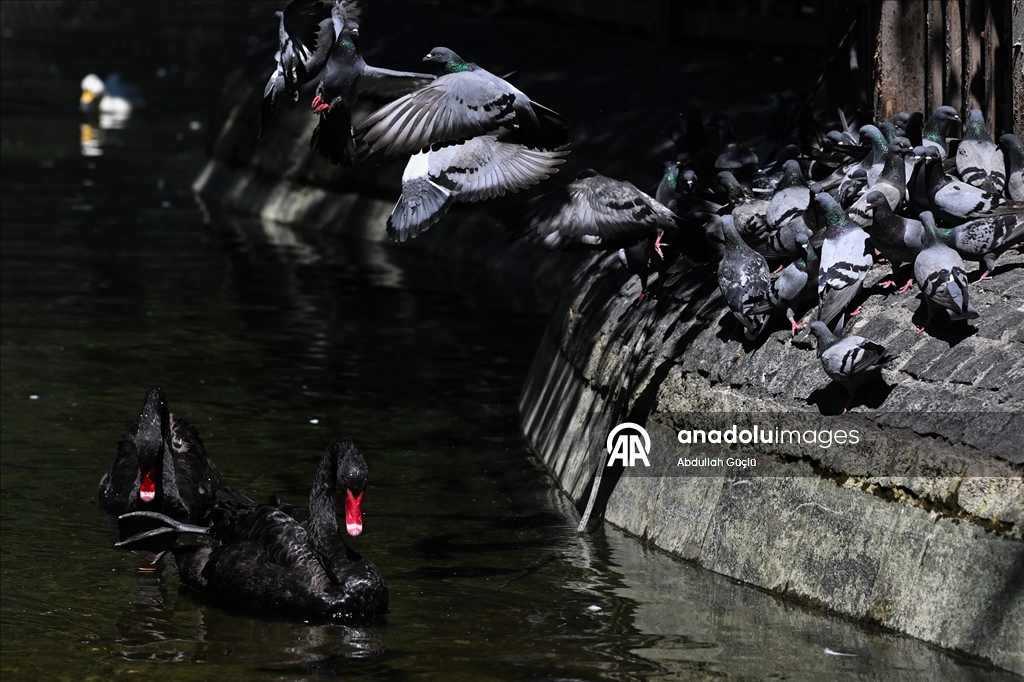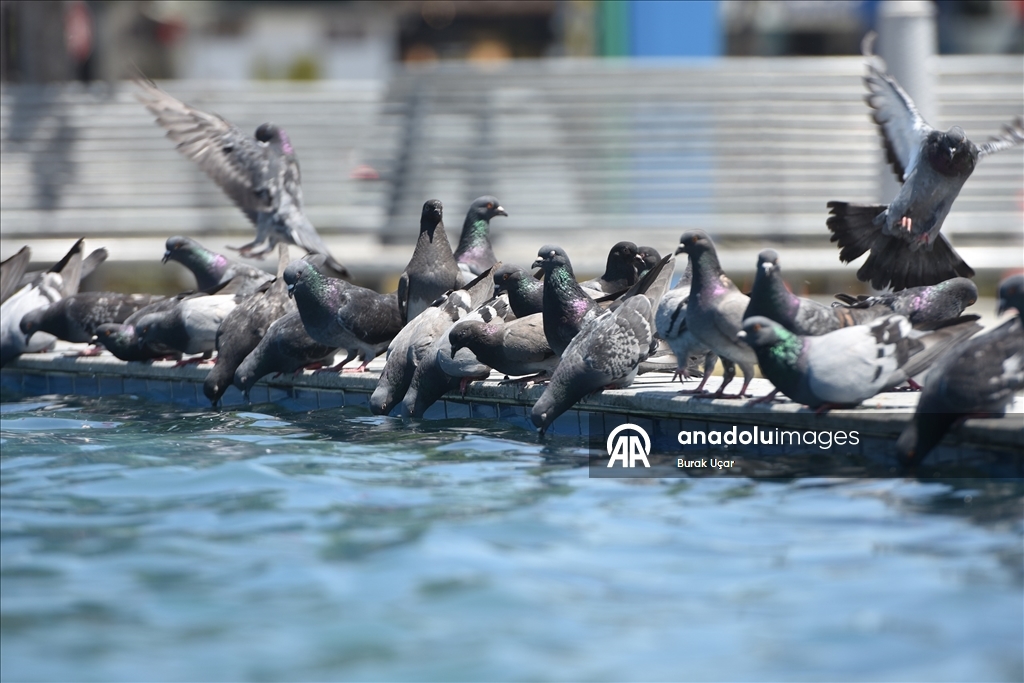 Sıcak havadan etkilenen güvercinler havuzda serinlemeye çalıştı. (Burak Uçar - Anadolu Ajansı)Burak Uçar