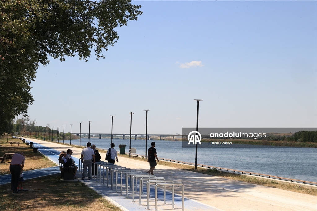 Gölgelik alanların fazla olduğu TOKİ Başkanlığınca Meriç Nehri kenarına yapılan Söğütlük Millet Bahçesi'ne giden Edirneliler, nehir kenarında vakit geçirdi. (Cihan Demirci - Anadolu Ajansı)Cihan Demirci
