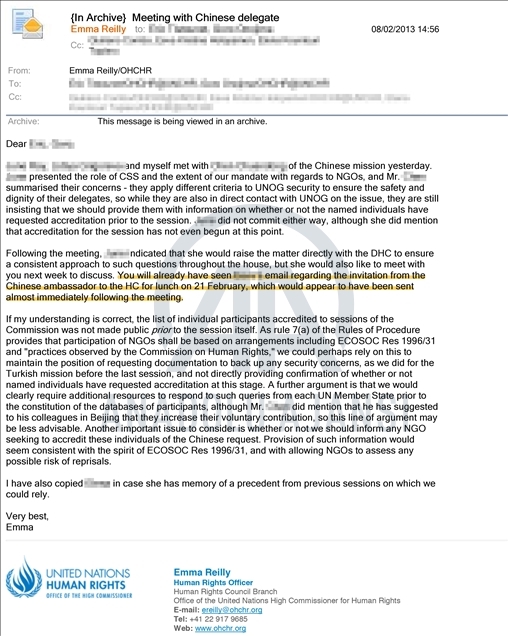 Birleşmiş Milletler İnsan Hakları Yüksek Komiserliğinin (OHCHR), başta Uygur aktivistler olmak üzere, Tibetli, Hong Konglu muhaliflerin isimlerini Çin hükümetiyle paylaştığına ilişkin iddialar, Anadolu Ajansının (AA) ulaştığı yazışmalarla yeni bir boyut kazandı. Komiserliğin, Çin hükümetiyle muhaliflerin isimlerini paylaştığı iddialarını birçok kez dile getiren OHCHR çalışanı ve insan hakları avukatı Emma Reilly (fotoğrafta) , OHCHR'de aktif görevdeyken tanık olduğu e-posta yazışmalarını AA muhabiriyle paylaştı.