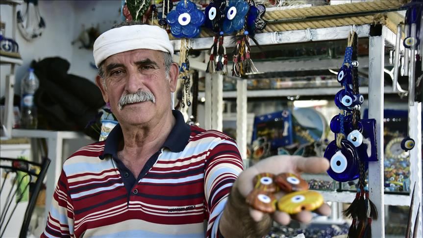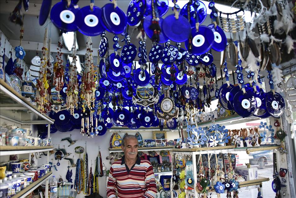Türkiye'nin gözde turizm merkezinden Muğla'nın Bodrum ilçesinde yaşayan Halit Arabalı, 53 yıldır nazar boncuğu üretiyor. ( Ali Ballı - Anadolu Ajansı )Ali Ballı