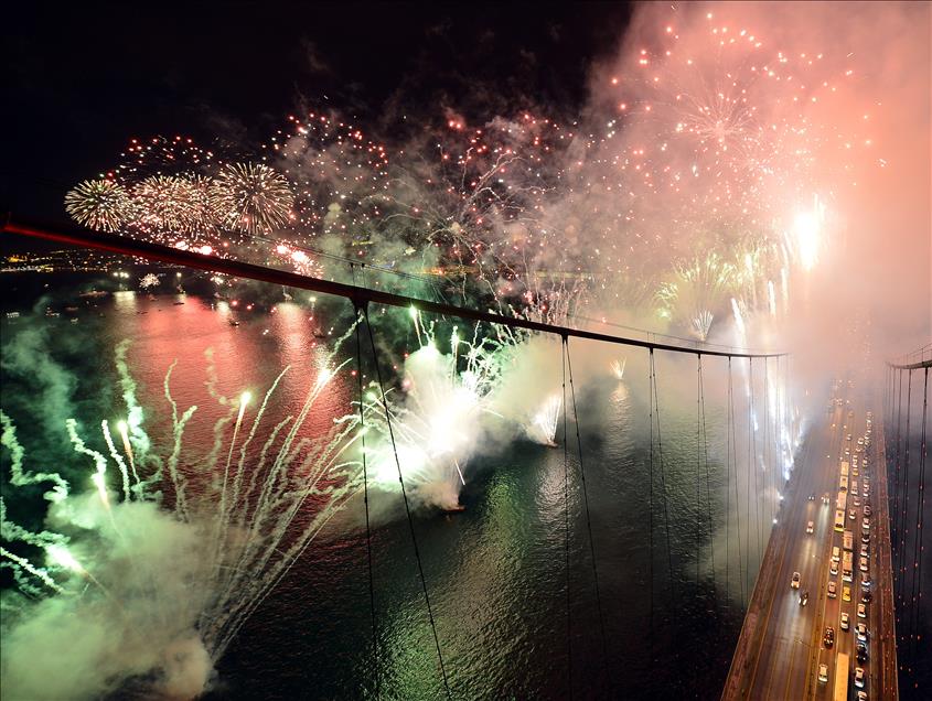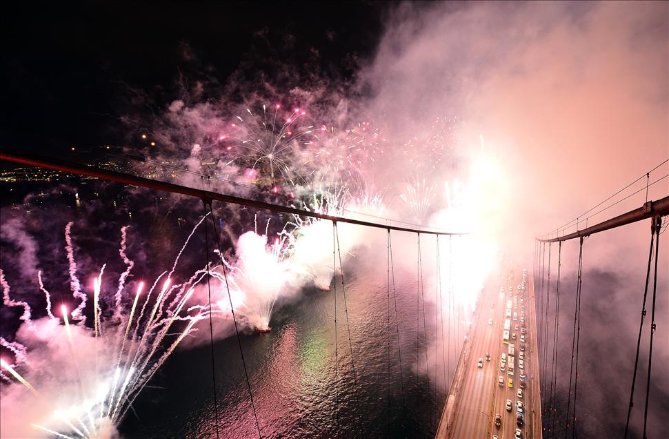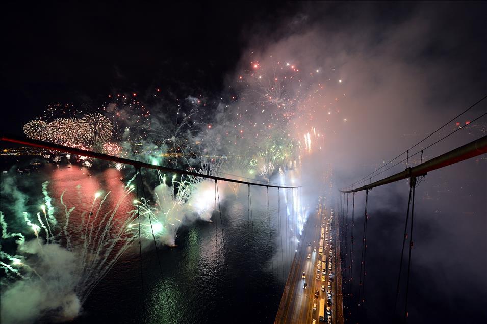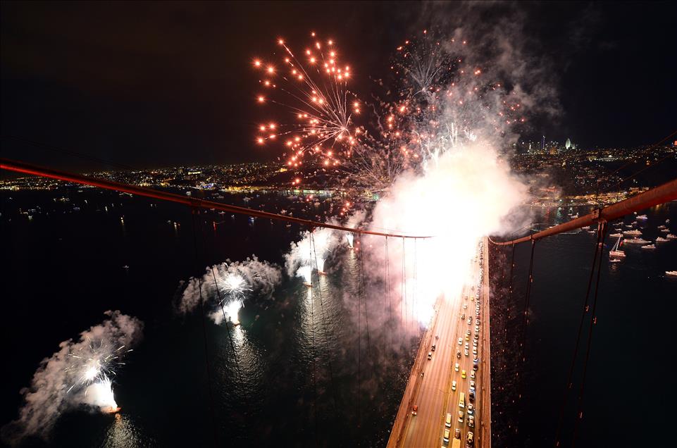ISTANBUL BUYUKSEHIR BELEDIYESI 29 EKIM CUMHURIYET BAYRAMI ETKINLIKLERI CERCEVESINDE BOGAZ KOPRUSU VE ISTANBUL BOGAZI'NDA ISIK VE HAVAI FISEK GOSTERISI DUZENLEDI. (ANADOLU AJANSI - METIN PALA) (20121029)METIN PALA