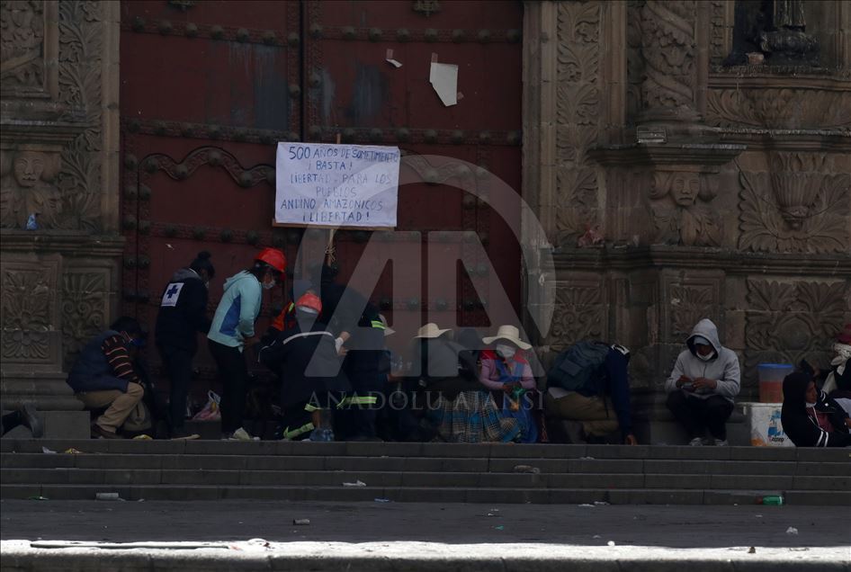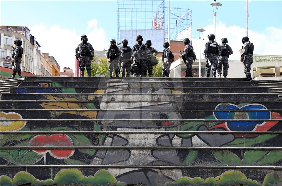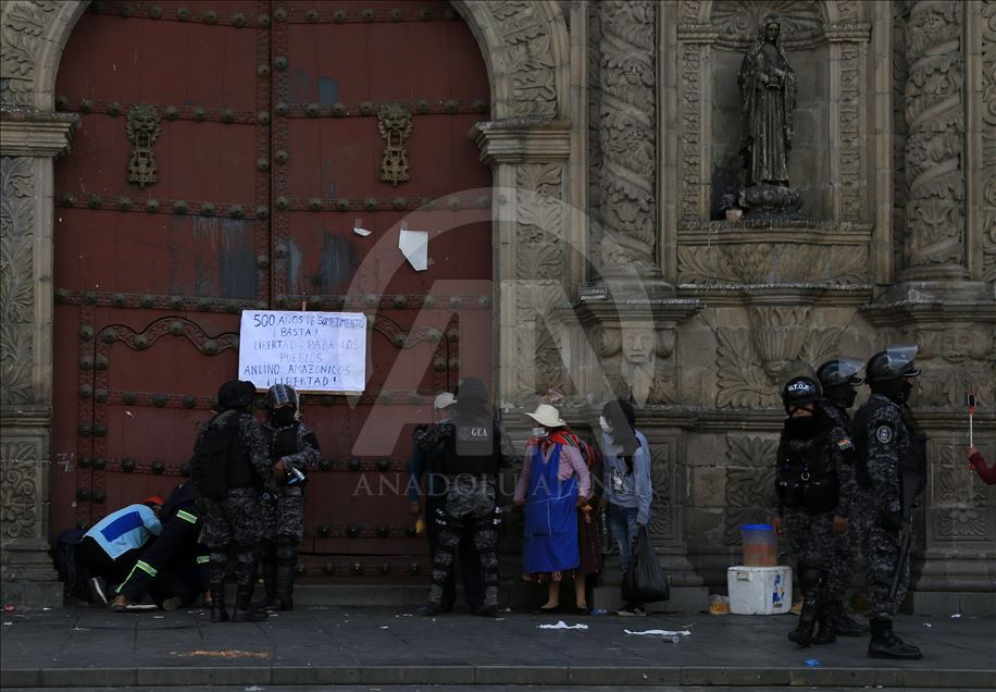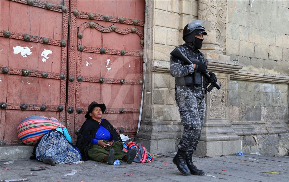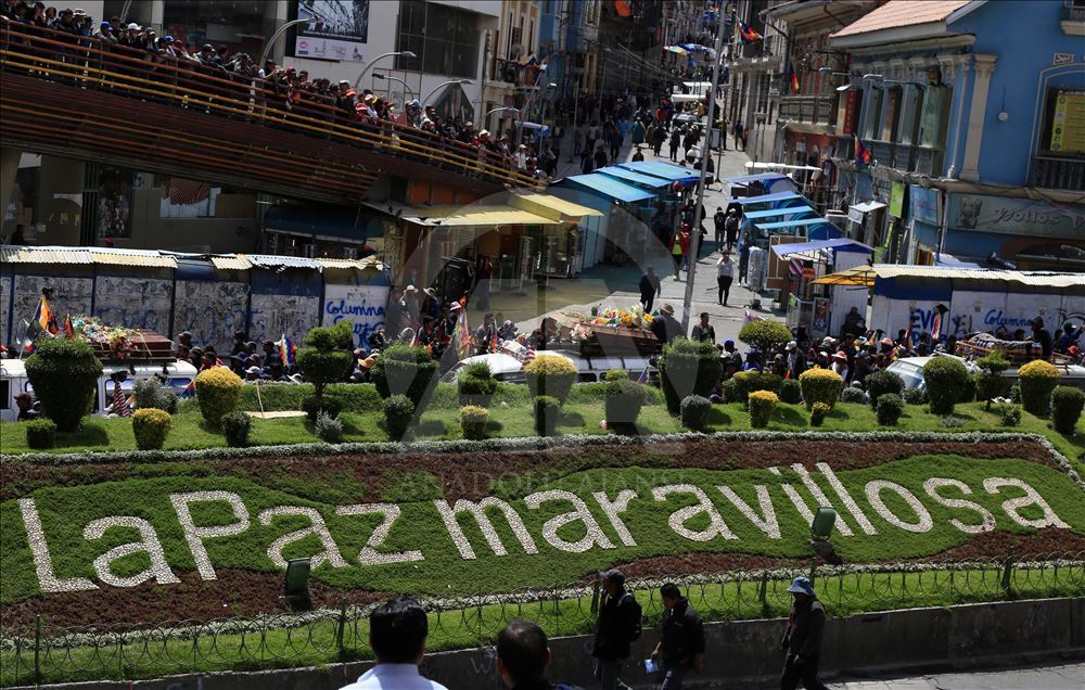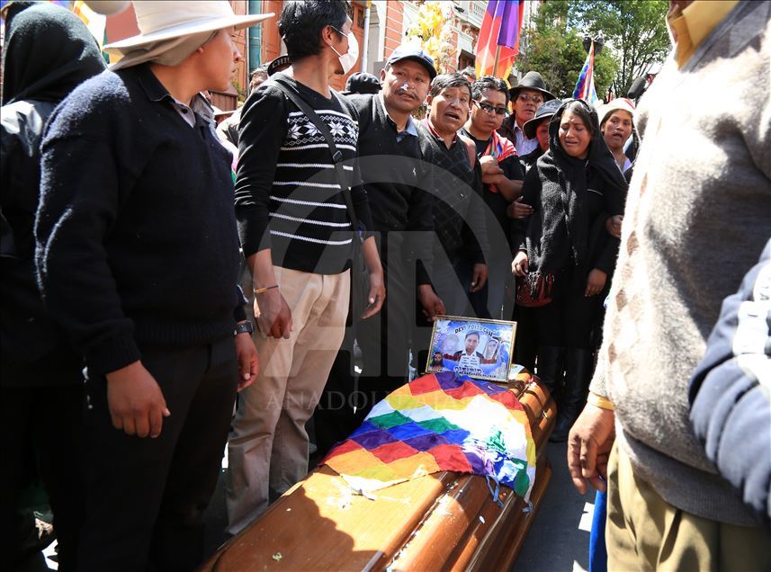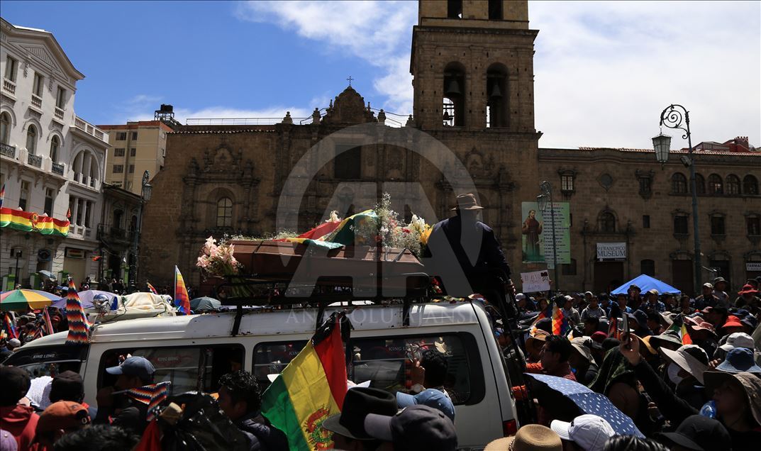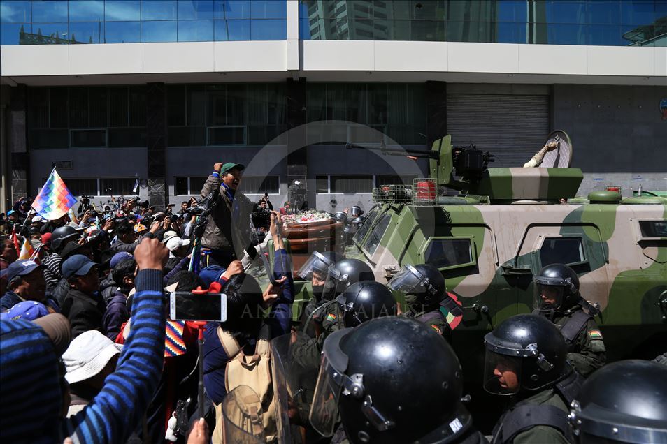 Bolivya'nın başkenti La Paz, önceki gün kentin bitişiğindeki şehir El Alto'da güvenlik güçlerinin müdahalesinde hayatını kaybedenler için düzenlenen adalet yürüyüşüne ev sahipliği yaptı. Ülkede istifa eden Devlet Başkanı Evo Morales'in yerine geçici devlet başkanlığına getirilen Jeanine Anez'in istifasını isteyen kişiler, operasyona hayatını kaybedenlerin cenazelerini kentin tarihi merkezine kadar taşıdı. Hükümet sarayının da bulunduğu Murillo Meydanı'na ilerlemek isteyen kalabalık güvenlik güçlerinin engeli ile karşılaştı. ( Lokman İlhan - Anadolu Ajansı )Lokman İlhan