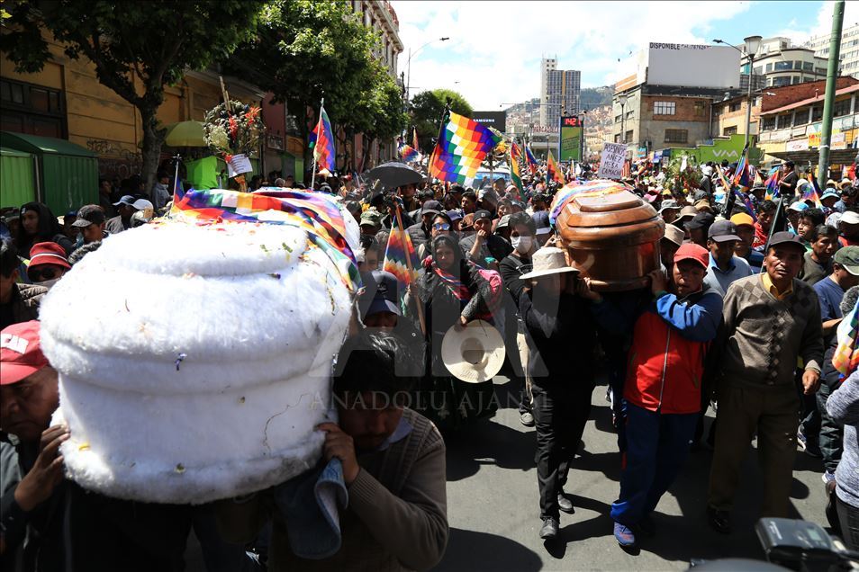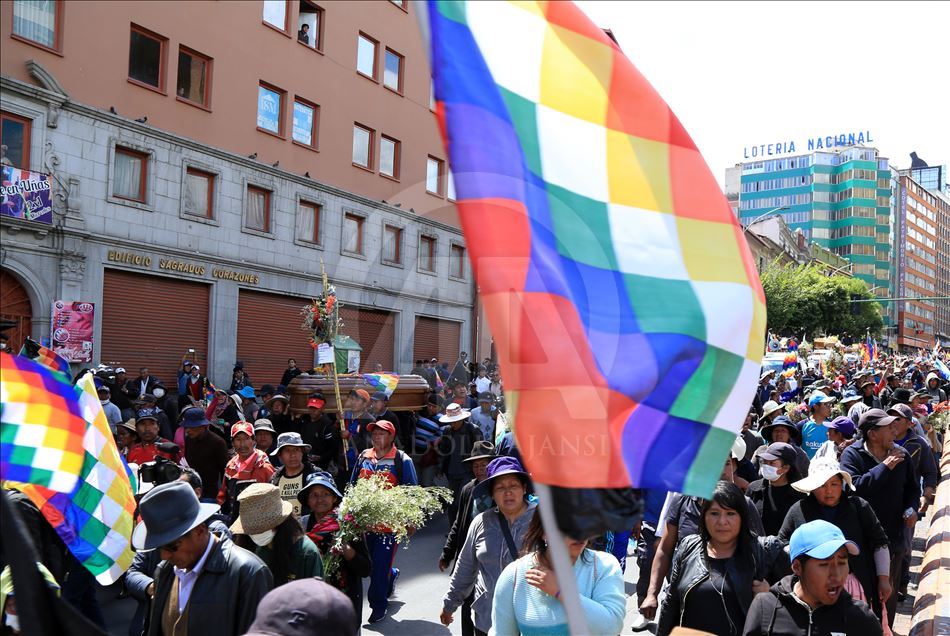 Bolivya'nın başkenti La Paz, önceki gün kentin bitişiğindeki şehir El Alto'da güvenlik güçlerinin müdahalesinde hayatını kaybedenler için düzenlenen adalet yürüyüşüne ev sahipliği yaptı. Ülkede istifa eden Devlet Başkanı Evo Morales'in yerine geçici devlet başkanlığına getirilen Jeanine Anez'in istifasını isteyen kişiler, operasyona hayatını kaybedenlerin cenazelerini kentin tarihi merkezine kadar taşıdı. ( Lokman İlhan - Anadolu Ajansı )Lokman İlhan