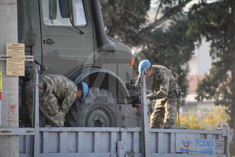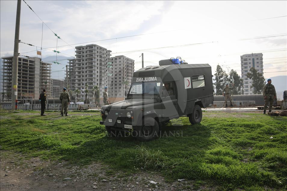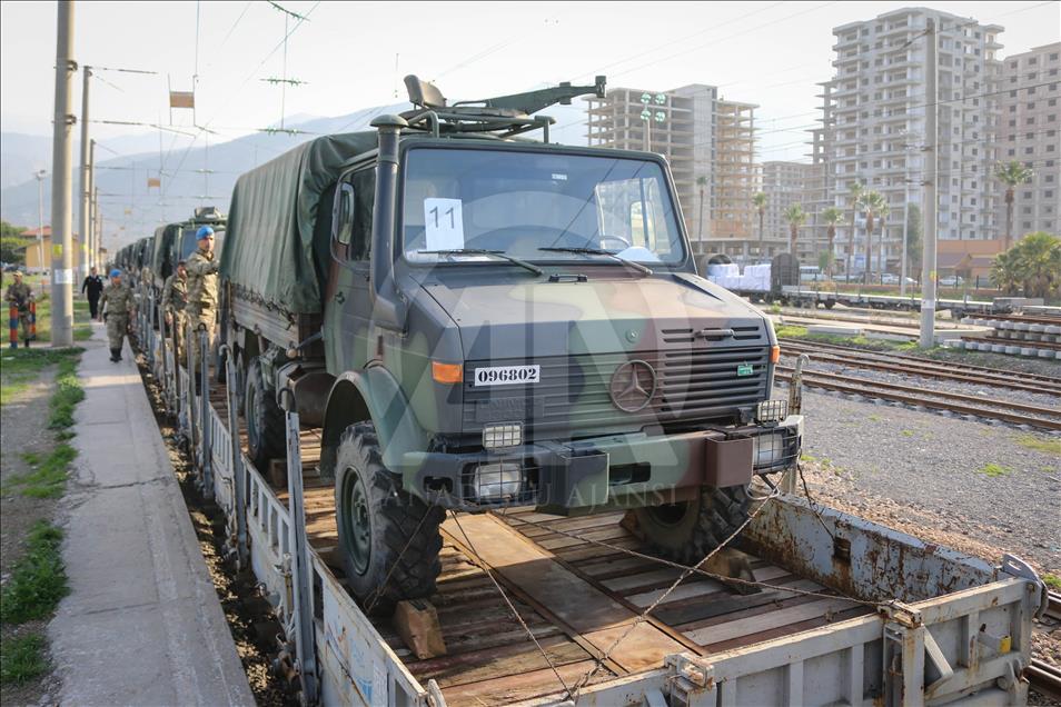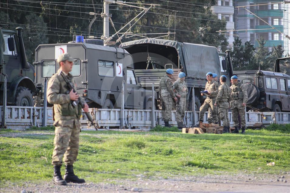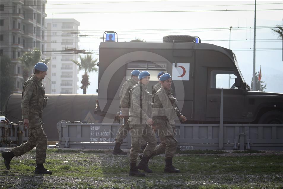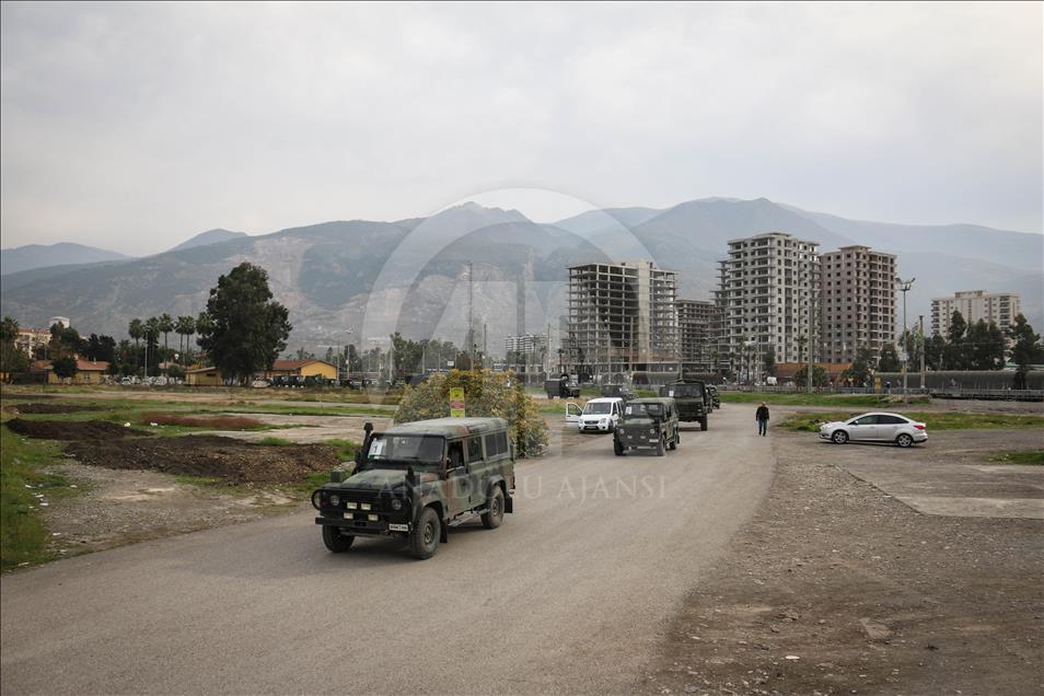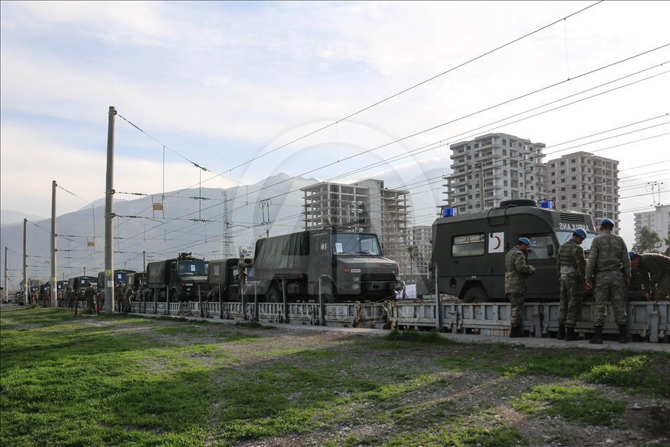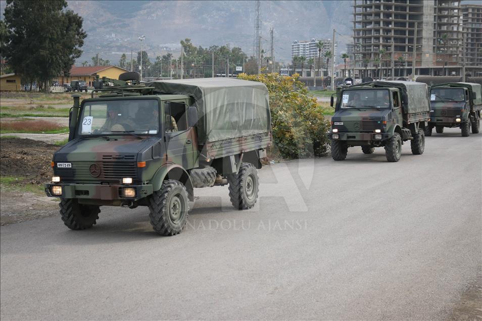 Türkiye'nin çeşitli birliklerinden gönderilen askeri araçlar ile Bolu 2. Komando Tugayı'nda görev yapan 70 asker Hatay'ın İskenderun ilçesine ulaştı. ( Burak Milli - Anadolu Ajansı )Burak Milli