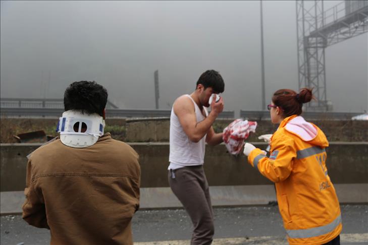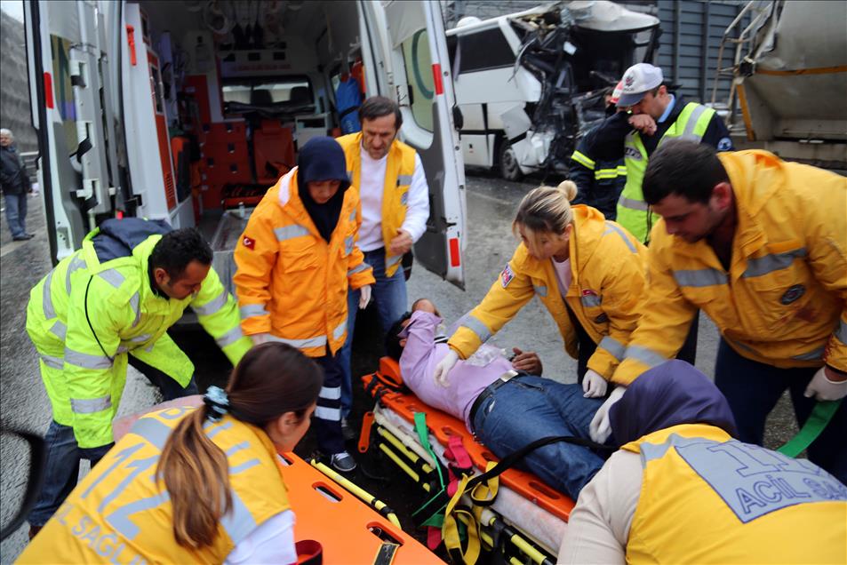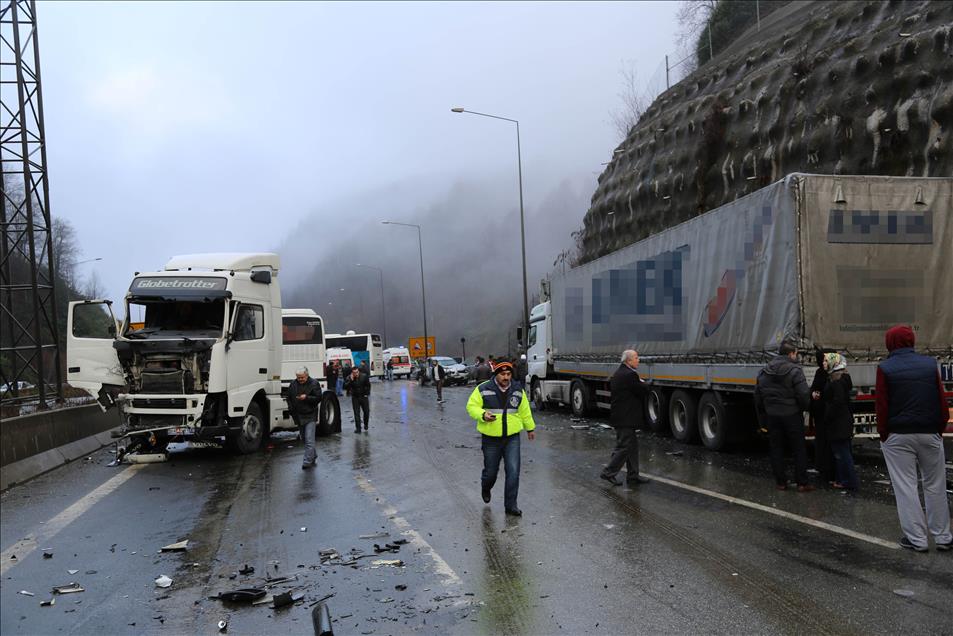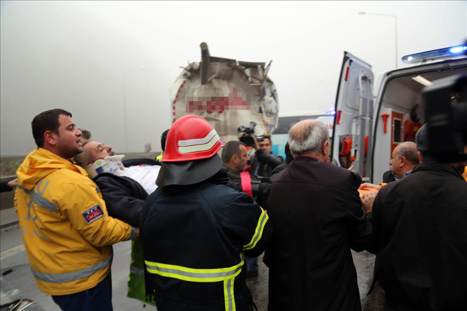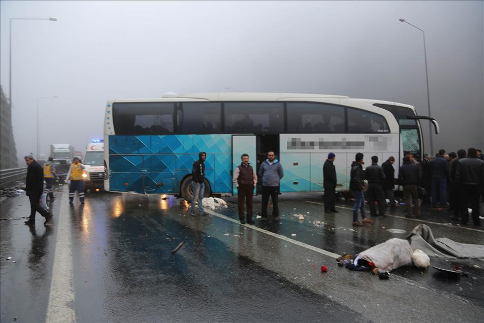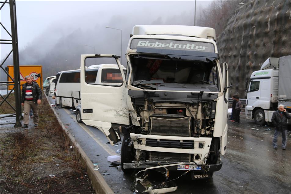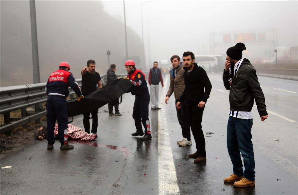 TEM otoyolu Bolu Dağı geçişinde ilk belirlemelere göre 3 yolcu otobüsü, bir tır, bir tanker, bir otomobil ve bir kamyonetin karıştığı zincirleme trafik kazasında 3 kişi öldü, 15 kişi yaralandı. (Mehmet Emin Gürbüz - Anadolu Ajansı)Mehmet Emin Gürbüz