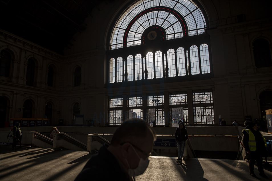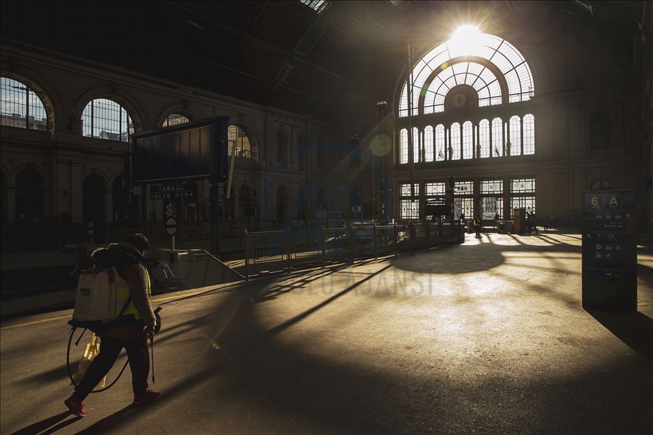 Macaristan'ın başkenti Budapeşte'de yeni tip koronavirüs (Kovid-19) salgını ile mücadele kapsamında Keleti Tren İstasyonu dezenfekte edildi.
