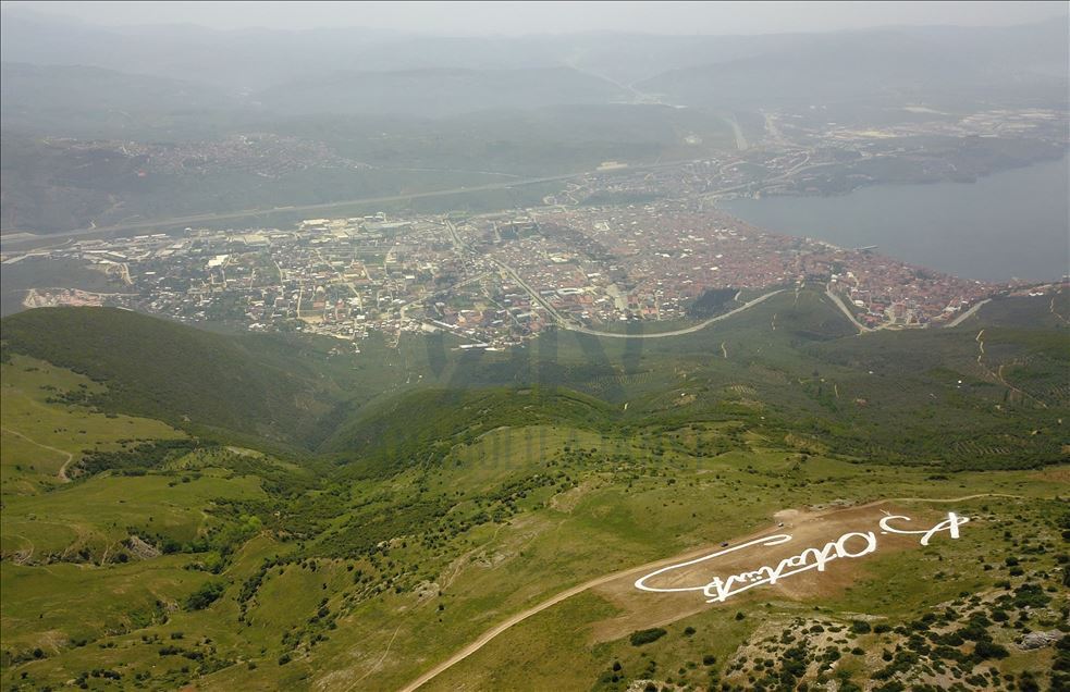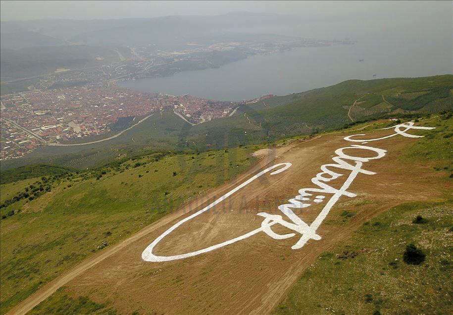 Büyük Önder Mustafa Kemal Atatürk’ün imzası, Bursa'nın Gemlik ilçesindeki tepeye çizildi. Gemlik Belediyesinden yapılan açıklamaya göre, imza Şahinyurdu mevkisinde, yangın sonucu orman vasfını kaybetmiş arazide yaklaşık 10 gün süren çalışmanın ardından tamamlandı. 70 metre eninde ve 216 metre boyunda bir alanda çizilen imza, İstanbul güzergahında seyreden uçaklardan görülebiliyor. ( Musa Öztürk - Anadolu Ajansı )Musa Öztürk
