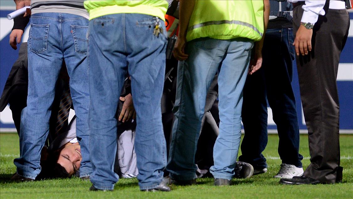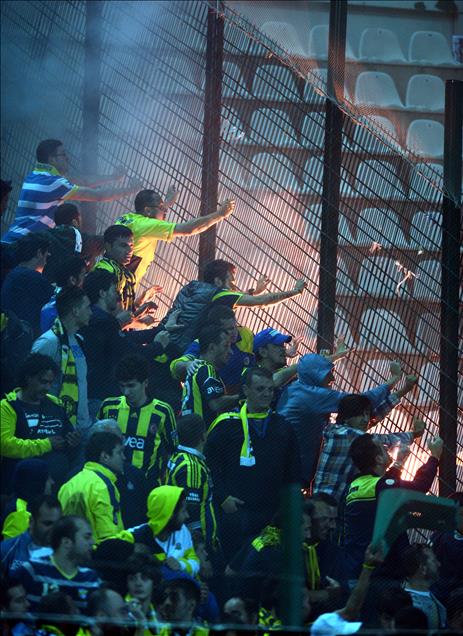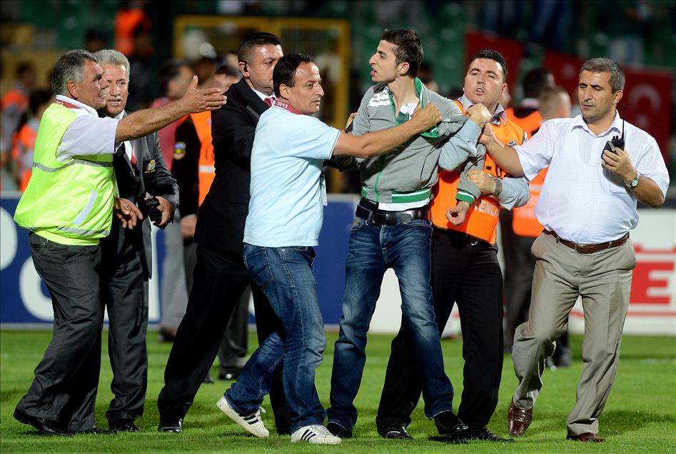 SPOR TOTO SUPER LIGI'NDE BURSASPOR ILE FENERBAHCE KARSILASTI. KARSILASMA 1-1 BERABERE TAMAMLANDI. MAC BITIMINDE IKI TAKIM TARAFTARLARI ARASINDA OLAY CIKTI. SAHAYA GIREN BAZI TARAFTARLAR ETKISIZ HALE GETIRILDI. (ANADOLU AJANSI - ALI ATMACA) (20121020)ALI ATMACA