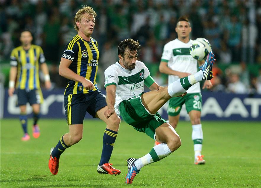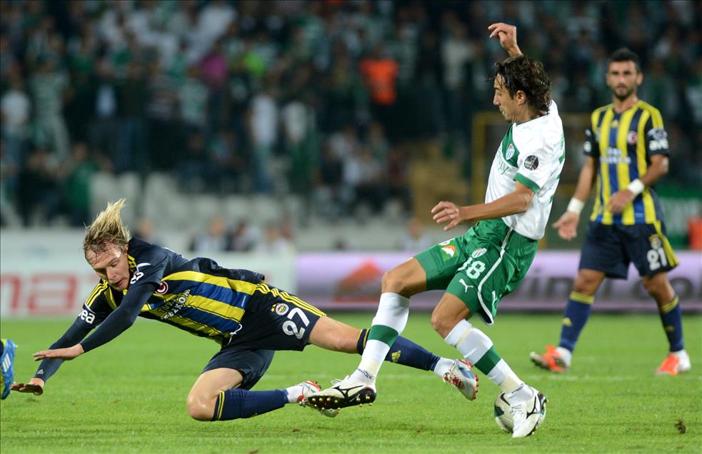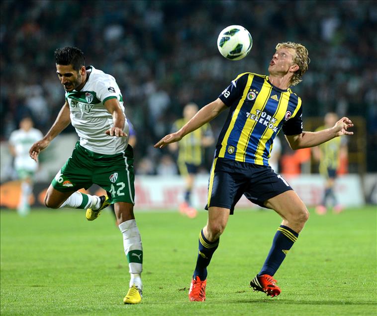 SPOR TOTO SUPER LIGI'NDE BURSASPOR ILE FENERBAHCE KARSILASTI. BIR POZISYONDA FENERBAHCELI FUTBOLCU DIRK KUYT RAKIBIYLE MUCADELE ETTI. (ANADOLU AJANSI - ALI ATMACA) (20121020)ALI ATMACA