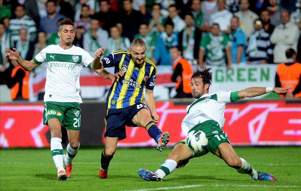 SPOR TOTO SUPER LIGI'NDE BURSASPOR ILE FENERBAHCE KARSILASTI. BIR POZISYONDA FENERBAHCELI FUTBOLCU CANER ERKIN RAKIBIYLE MUCADELE ETTI. (ANADOLU AJANSI - ALI ATMACA) (20121020)ALI ATMACA